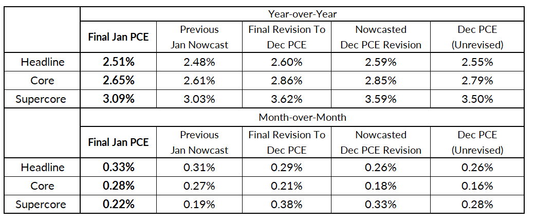 Our month-over-month Core PCE Nowcasts were reasonably accurate relative to today's final release, but the allocation of revisions with Q4 surprised to the upside and thus push year-over-year Core PCE inflation another 4 basis points higher and meaningfully higher than our nowecasts after PPI.