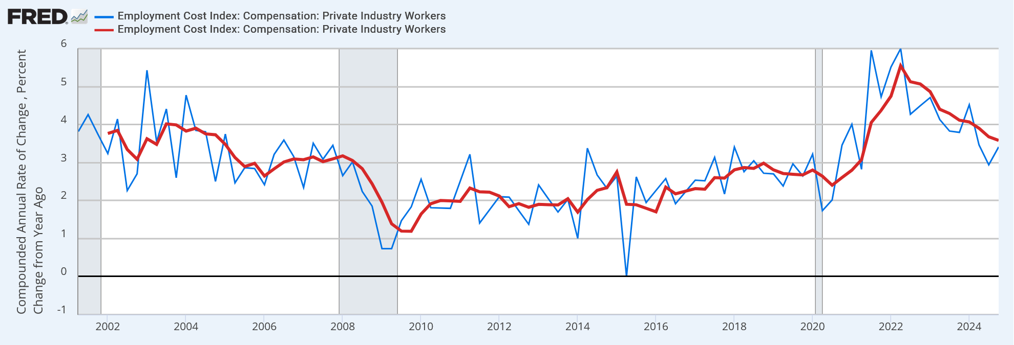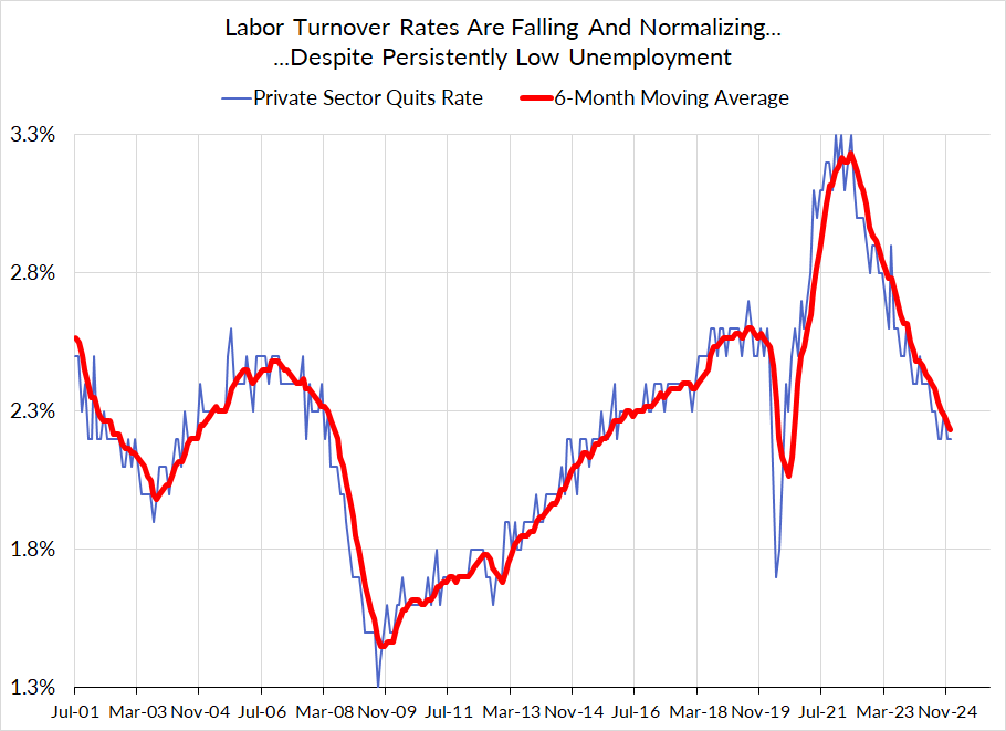 (2) Wage cost lags (~16bps excess contribution): There are an array of PCE components that are measured using opaque "input cost indices" that are intended to track primarily the labor cost of performing those activities. These indices tend to behave similarly to wage growth at a macroeconomic level, albeit with some lag. Wage growth at a macroeconomic level tends to be lagging too, especially to labor turnover dynamics. A low and falling "quits" rate implies wage growth is also poised to decelerate.