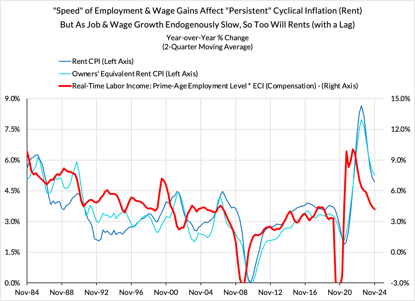 Right now Core PCE (PCE less food products and energy) is running at a 2.65% year-over-year pace as of January, 65 basis points above the Fed's 2% inflation target for PCE. That projected overshoot is disproportionately driven by catch-up rent CPI inflation in response to the surge in household formation (a byproduct of rapidly recovering job growth) and market rents in 2021-22. Rent is on track to contribute 21 basis points to the 65 basis point Core PCE overshoot.