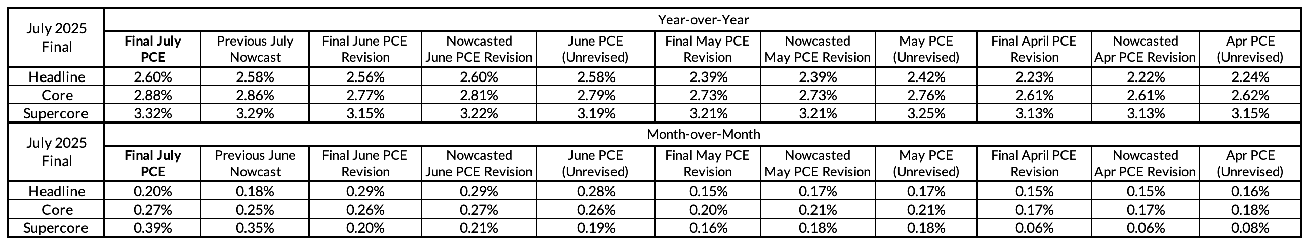 Our nowcasts fared well yet again this month (off by 2bps), though this time the final outcome was right between our pre-GDP and post-GDP estimates. Core PCE is right around 2.9% now on a year-over-year basis and would need to average less than 28bps on a m/m basis until year-end to avoid exceeding the Fed's current projections. That should be doable but given a .27% m/m reading in July, it's simply too soon to say.