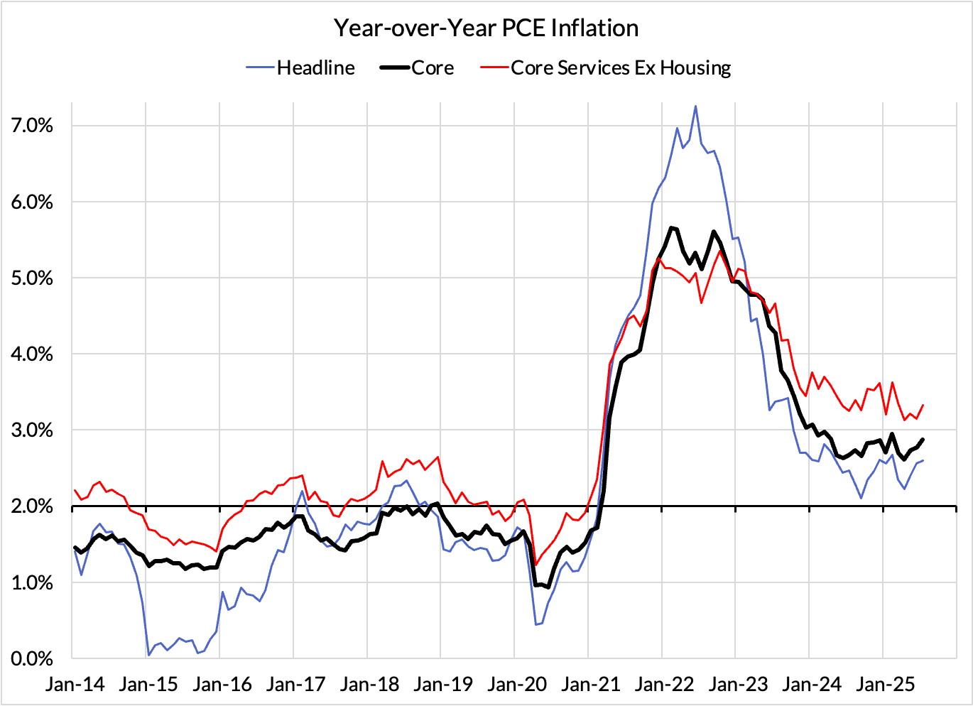 Inflation appears to be headed in the wrong direction. Back when the Fed first began cutting in September 2024, they were seeing a Headline PCE inflation rate of 2.27% y/y and a Core PCE inflation rate of 2.71% y/y. Those gauges are now .3% and .2% higher respectively. This should not be happening given the favorable lags coming into the year from housing, financial services, and input cost components to PCE, which were all running hotter but poised to cool (and have in fact cooled).