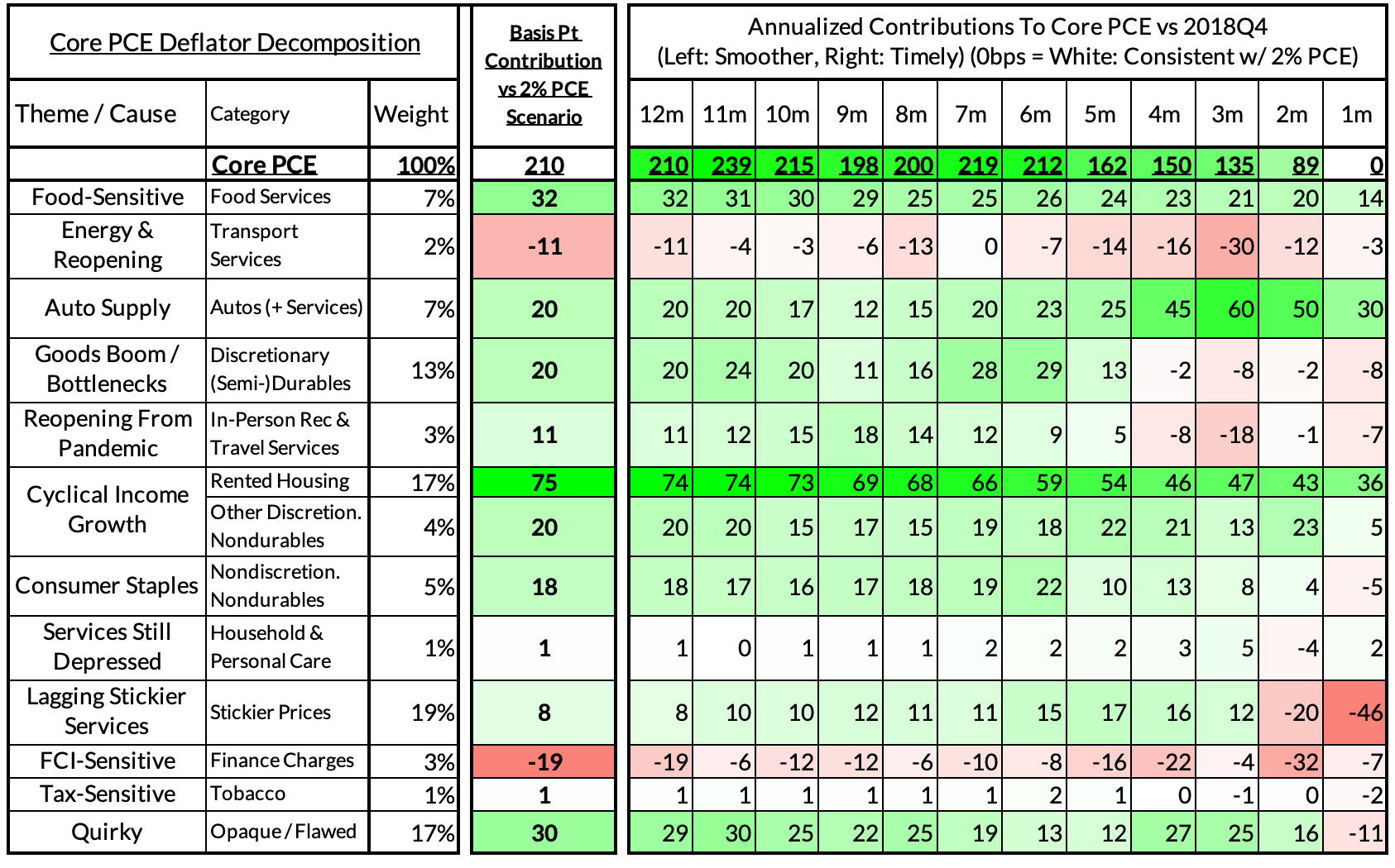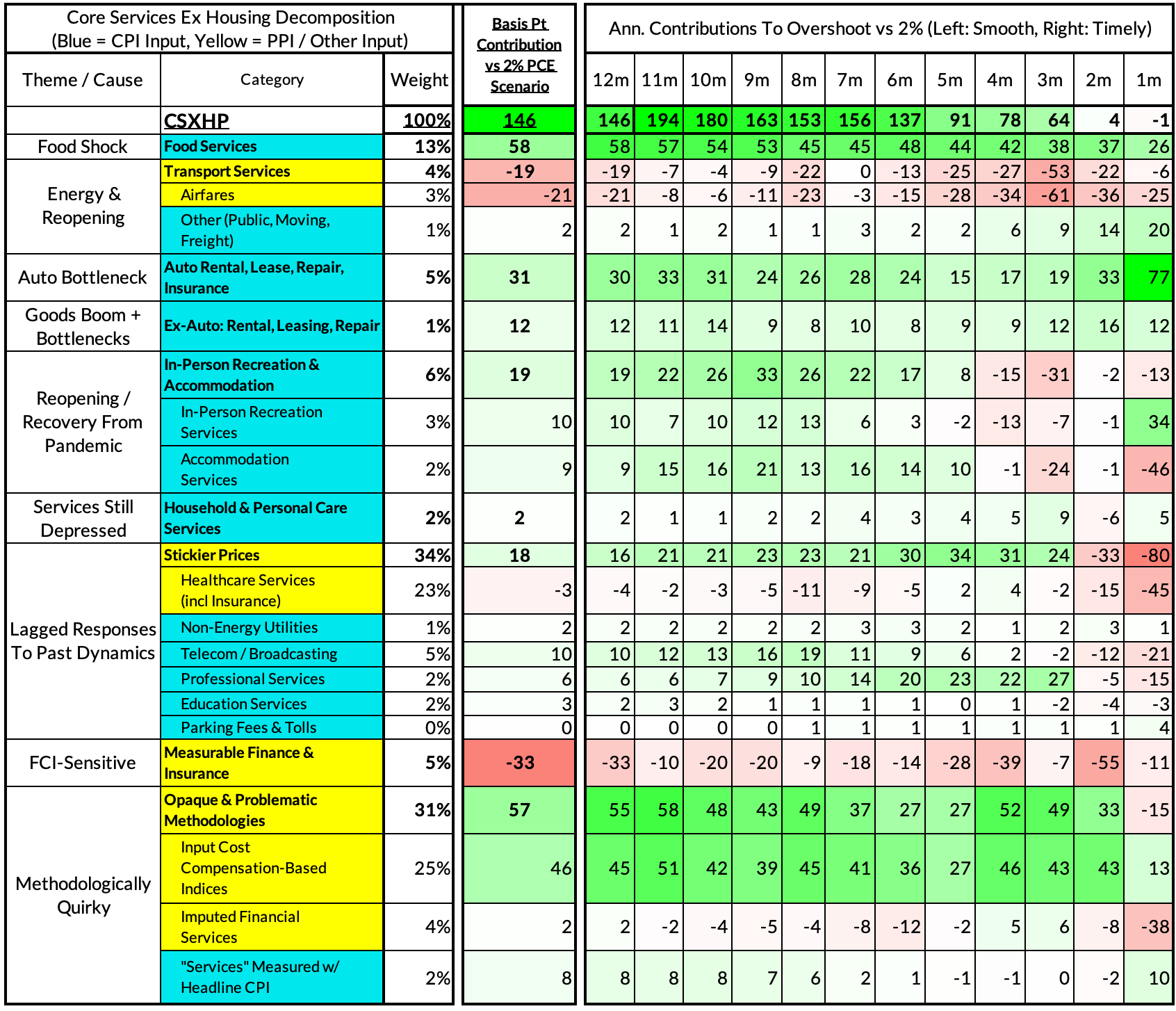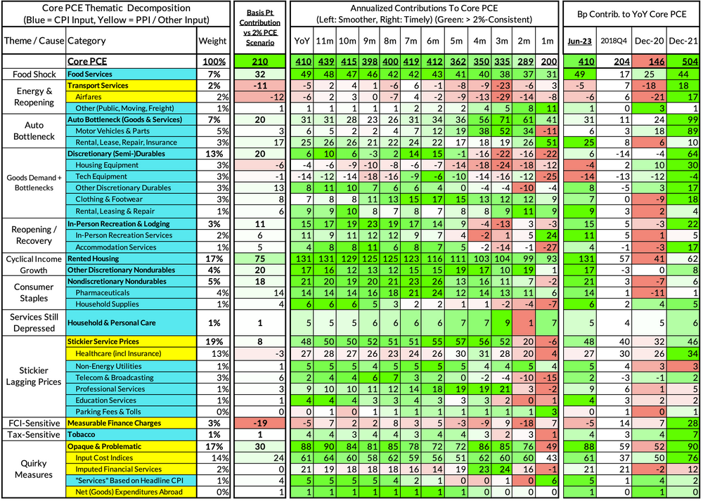 There's 210 basis points of core inflation overshoot that needs to be worked off for the Fed to hit its goals. Let's start from most important to least, with the note that a realistic 2% PCE scenario likely requires some of the categories below to not merely "stop overshooting" but to also "begin undershooting" what's consistent with 2% Core PCE.