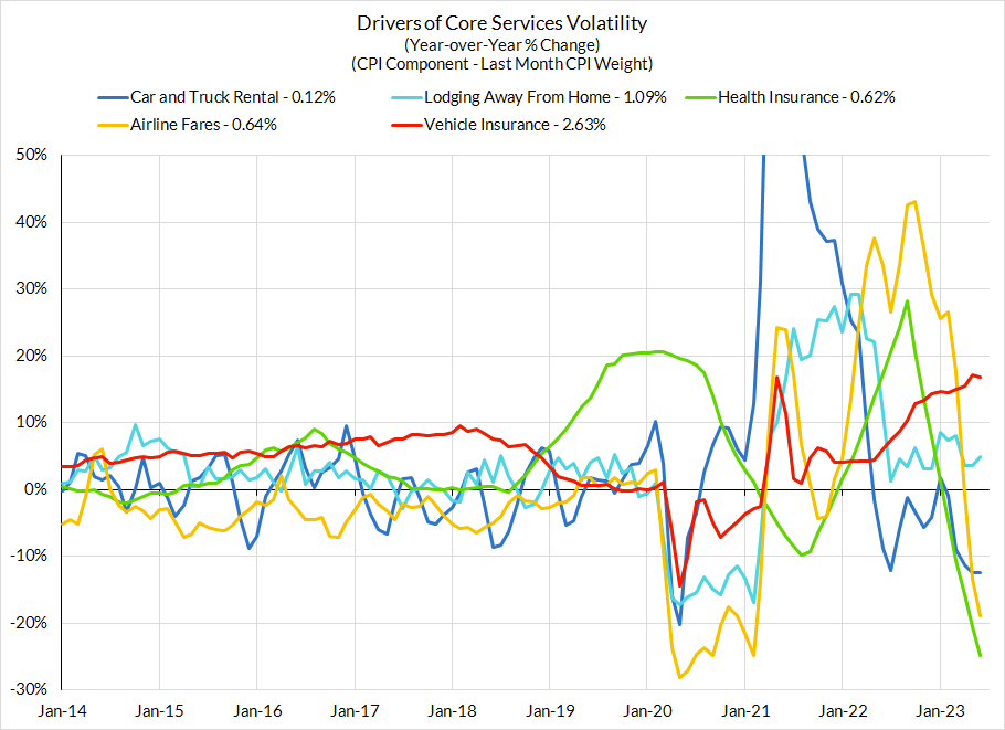 - Auto Supply Recovery (20bps out of 210): We've been dealing with depressed motor vehicle production for over 2.5 years and only in the last few months have we seen accelerated production near pre-pandemic levels. This has implications that extend beyond new and used vehicle prices, which should begin another spell of deflation in Q3. It should also cool a range of services prices that have run hot in PCE: vehicle rental, leasing, repair, and insurance. Those service prices tend to move with a lag relative to auto values but should be more of a tailwind in 2024, at least when looked at in totality. We are optimistic that the basket of prices sensitive to auto values will be a substantial driver of disinflation in the next 12-15 months.