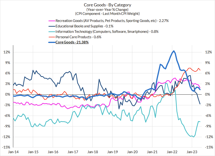 - In-Person Service Prices (11bps out of 210): Until recently, this was a major driver of the inflation overshoot but saw some chunky bits of deflation through recreation services and lodging. Revenge services demand tied to reopening appears to be cooling in nominal and real terms after a strong 2022. We expect more normalization here but with further bumps in the road given the volatility of price changes of late.