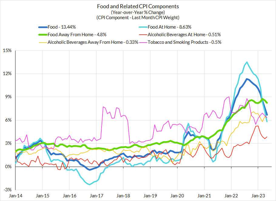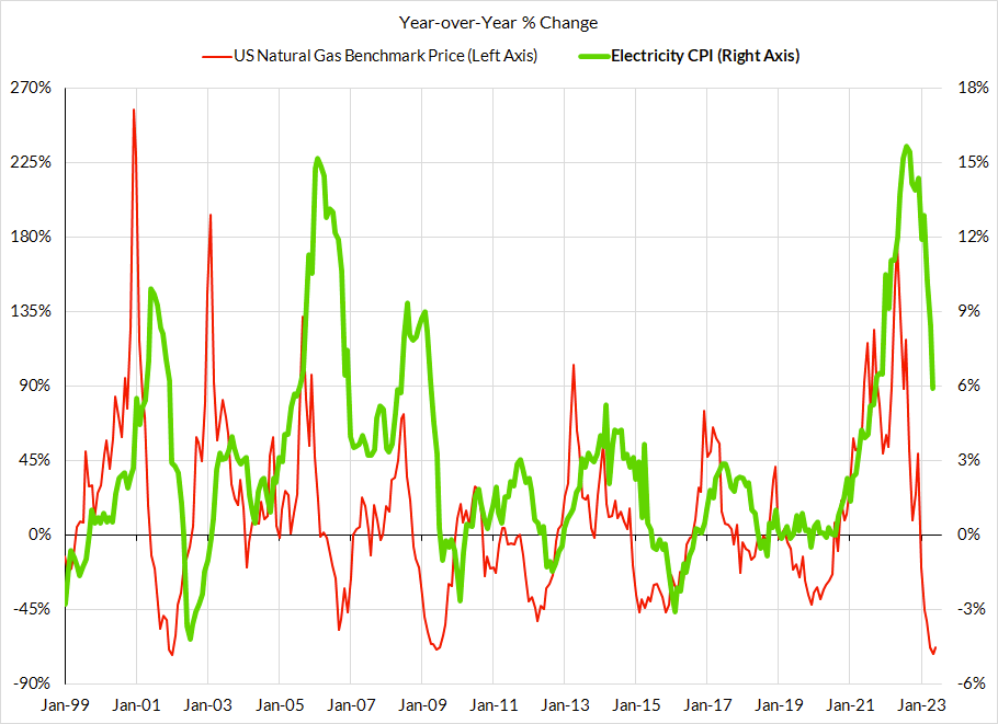 - Headline Inflation Dynamics: Disinflation in food prices and lower benchmark natural gas prices could still bring further downside risk to headline CPI than what the forecasting consensus implicitly pencils in, but that discrepancy is smaller now than in past months where we've rightly flagged this issue. And food services CPI doesn't count to core CPI but it does matter a lot to core and core services ex housing PCE.