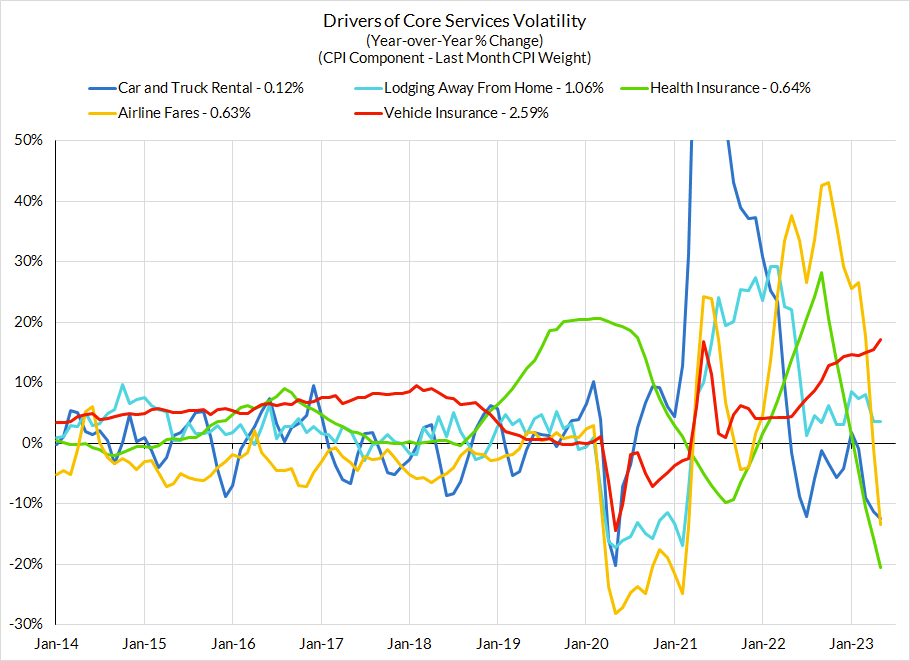 - Auto Supply Recovery (27 out of 262): We've been dealing with depressed motor vehicle production for over 2.5 years and only in the last few months have we seen accelerated production near pre-pandemic levels. This has implications that extend beyond new and used vehicle prices, which should begin another spell of deflation in Q3. It should also cool a range of services prices that have run hot in PCE: vehicle rental, leasing, repair, and insurance. Those service prices tend to move with a lag relative to auto values but should be more of a tailwind in 2024, at least when looked at in totality. We are optimistic that the basket of prices sensitive to auto values will be a substantial driver of disinflation in the next 12-15 months.