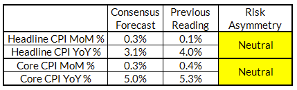 Summary: The risks for June (CPI) are finally looking more balanced after three previous months of lurking upside risk. We can see meaningful upside and downside scenarios here. From July through September, we are likely to flag downside risk to Core CPI and to a lesser extent Headline CPI.