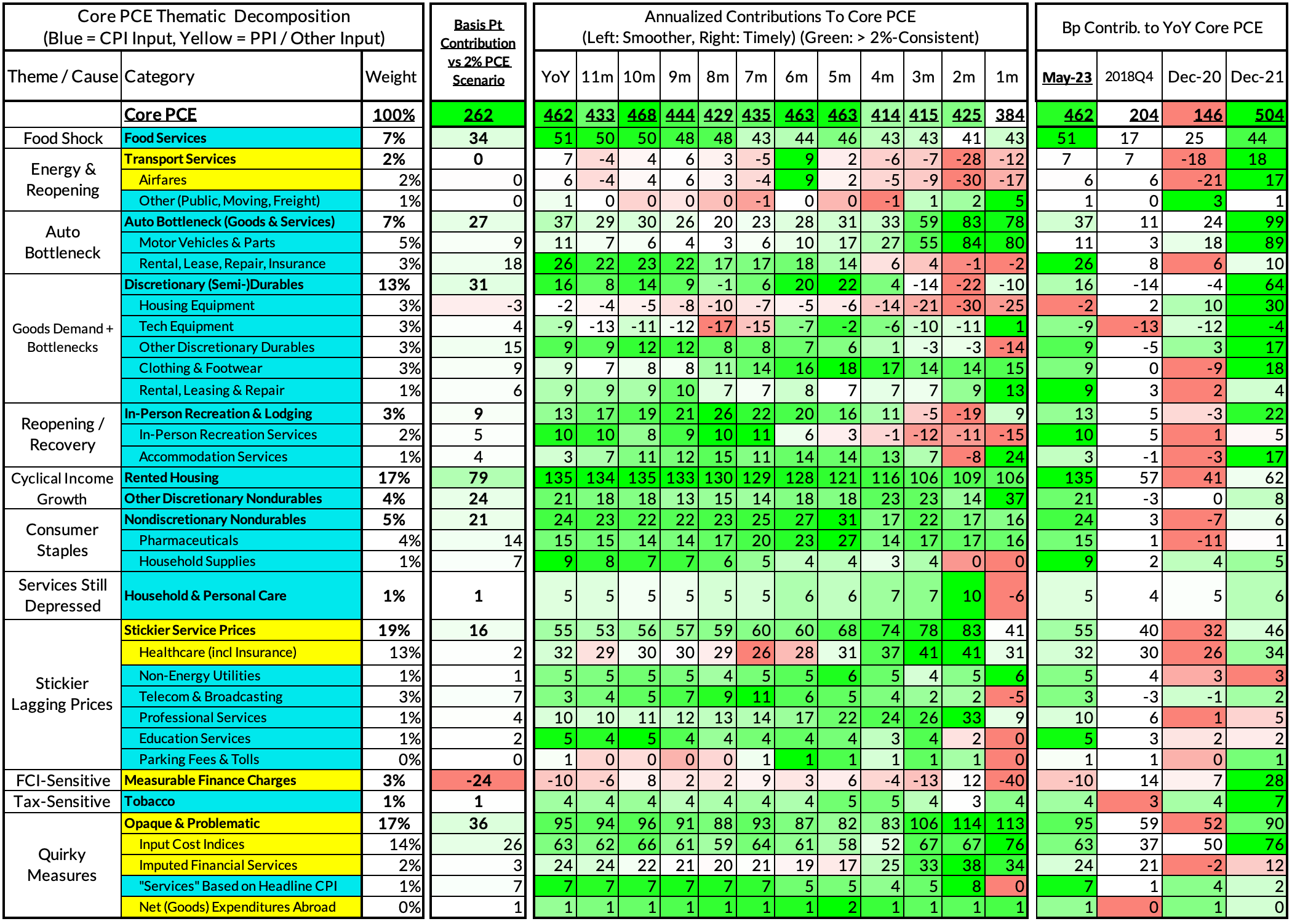 The final heatmap here gives you a sense of the overshoot on shorter annualized run-rates. April monthly annualized core PCE yielded a 180 basis point overshoot vs 2% target inflation (3.80% annualized).