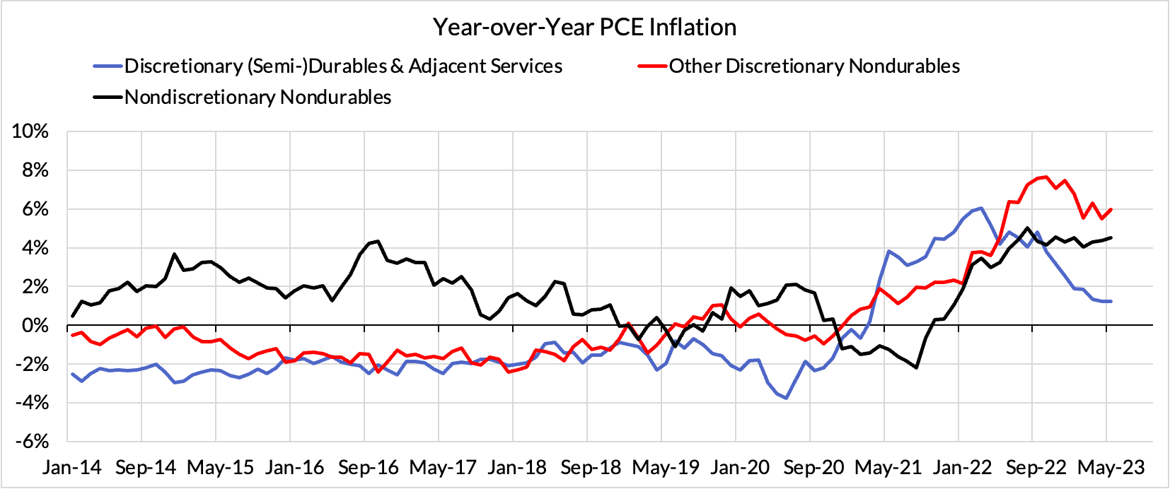 - Goods Deflation Ex Autos (76bps out of 262): Only in the past couple of months have we seen a broadening of goods deflation into discretionary durables (ex autos) and consumer staples. Elevated goods demand has been substantially destroyed in the past 12 months and cost shocks through the price of transportation, diesel, and chemicals are likely only now in a position to help ease the inflation path here. This process is likely to proceed slowly but last two months suggest we're on the path to 2%-consistent PCE readings here. Discretionary nondurables are the lone area in the goods complex where there is less sign of progress; it is still responsible for 24bps of the 260bp core PCE overshoot. We are not so sure all of the overshoot here will normalize in 12-15 months but a substantial subset still should.