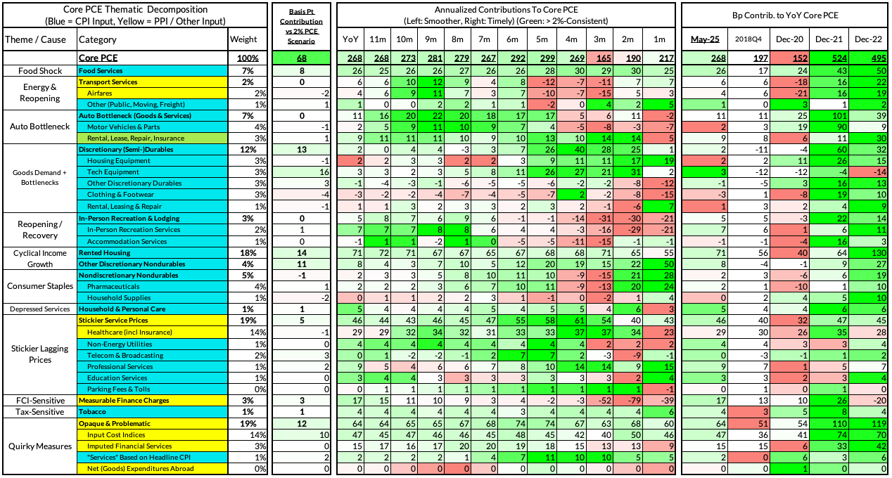 The final heatmap below gives you a sense of the overshoot on shorter annualized run-rates. May monthly annualized Core PCE ran at a 2.17% annualized pace, a 17 basis point overshoot vs 2% target inflation.