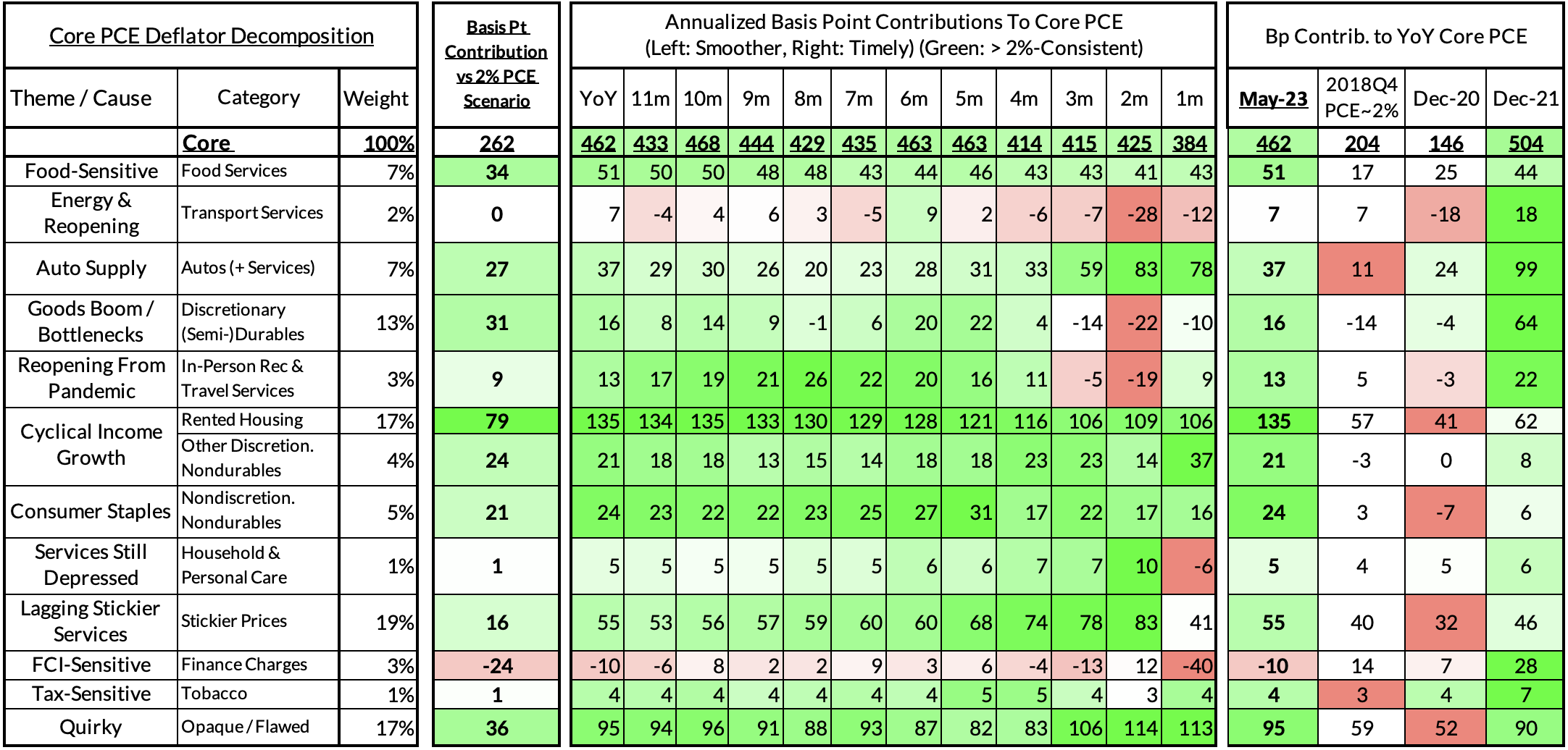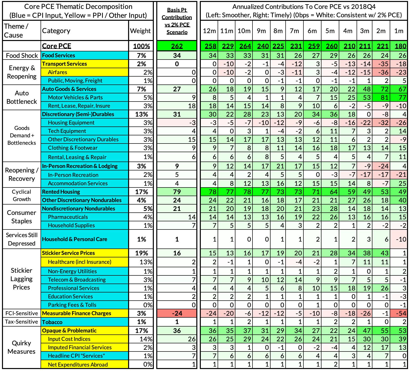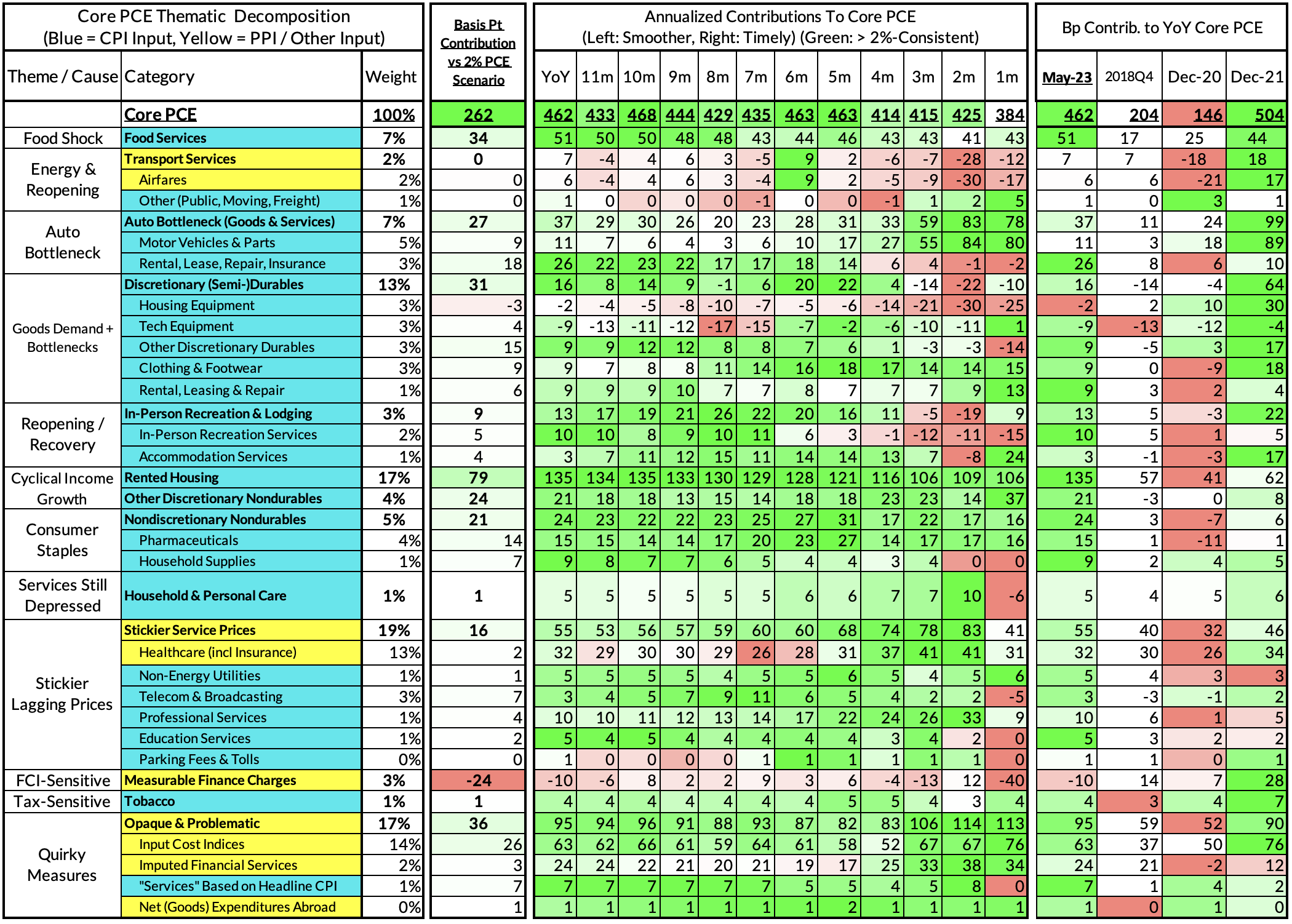 The final heatmap here gives you a sense of the overshoot on shorter annualized run-rates. April monthly annualized core PCE yielded a 180 basis point overshoot vs 2% target inflation (3.80% annualized).