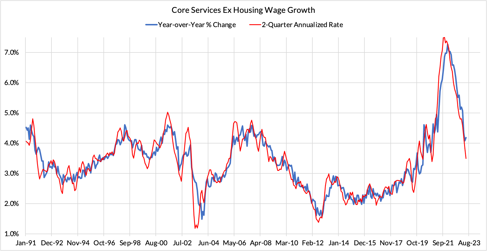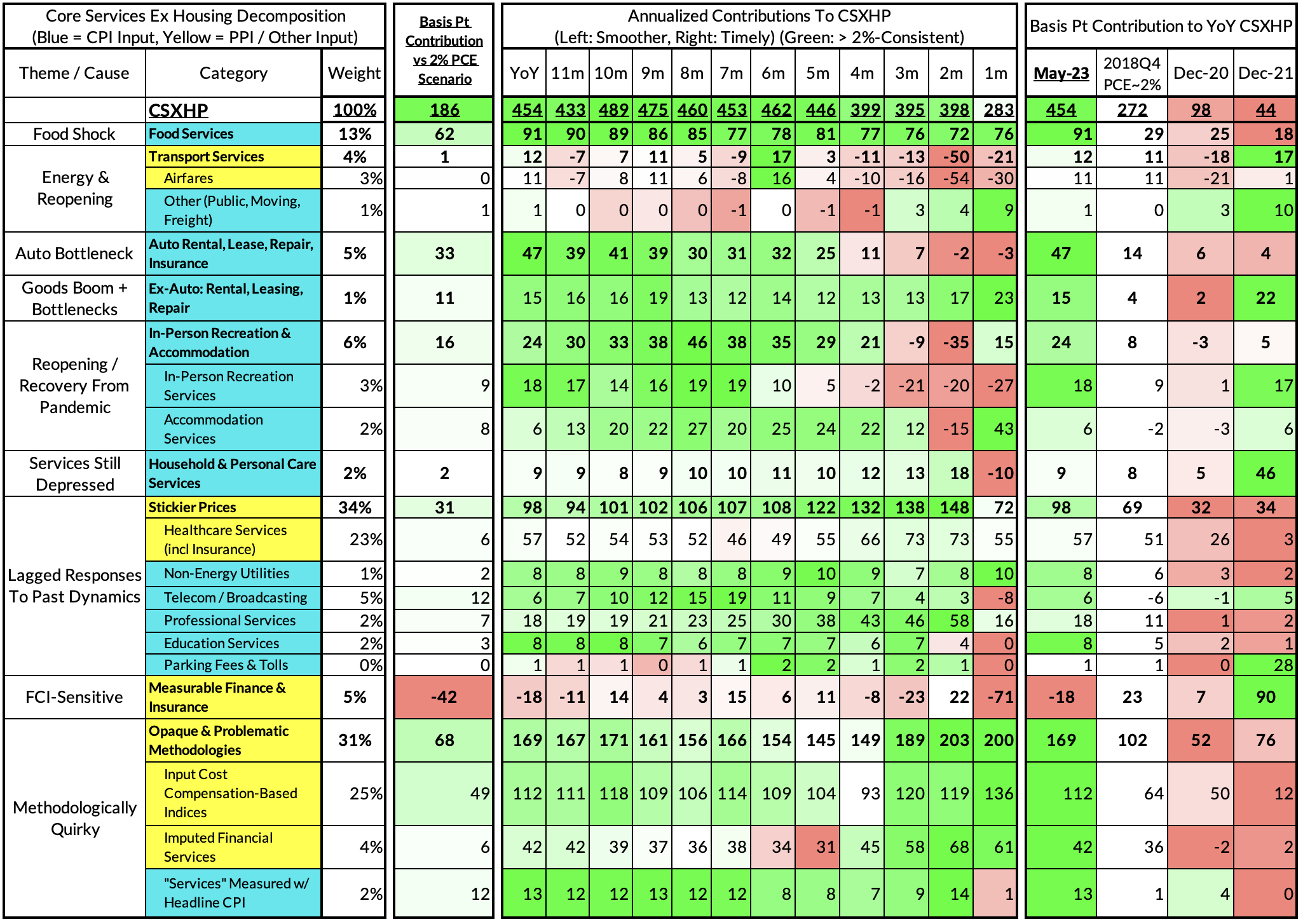 - Core Services Ex Housing PCE (CSXHP) fell, from 4.62%* year-over-year in April to 4.54% in May. (0.23% monthly increase, relative to our latest 0.22% monthly nowcast). *Revisions push down April year-over-year readings from 4.65% to 4.62%. When core PCE is running at 2%, CSXHP typically runs at 2.68%. The current overshoot is effectively 197 basis points.