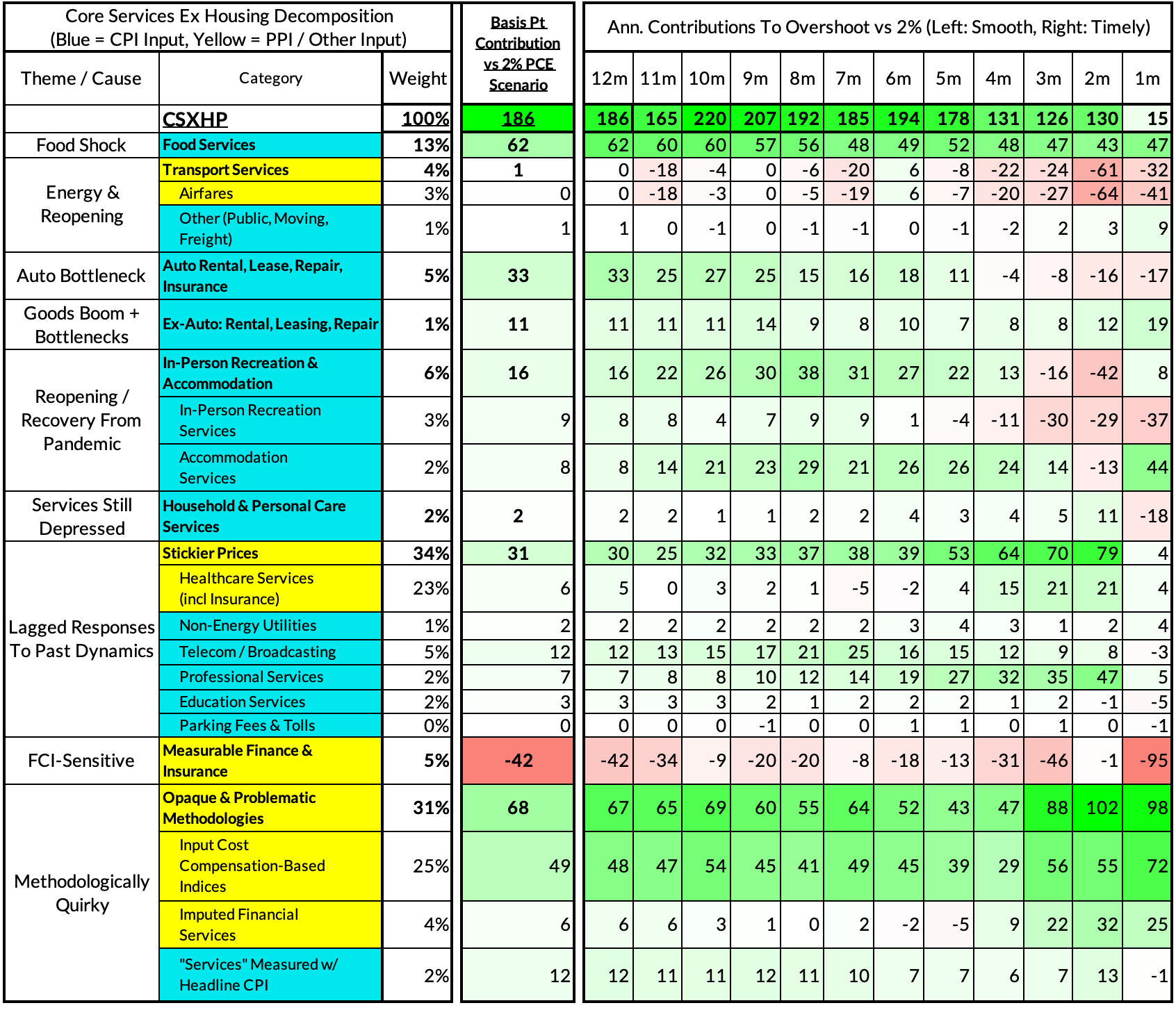 There are other contributors to the overshoot, some more supply-driven (automobile bottlenecks likely explain 27 basis points, while food inputs likely added 34 basis points to the overshoot), some more demand-driven (in-person recreation and travel services adding 9 basis points to the overshoot, consumer staples and discretionary nondurables adding 45 basis points).
