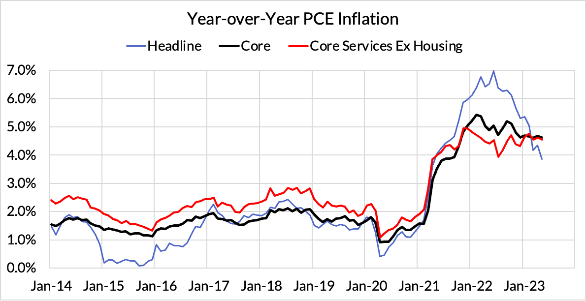 - Headline PCE fell, from 4.34%* year-over-year in April to 3.85% in May. (0.13% monthly increase, relative to the 0.23% nowcast). *Revisions pushed down year-over-year readings from 4.36% to 4.34% for April.