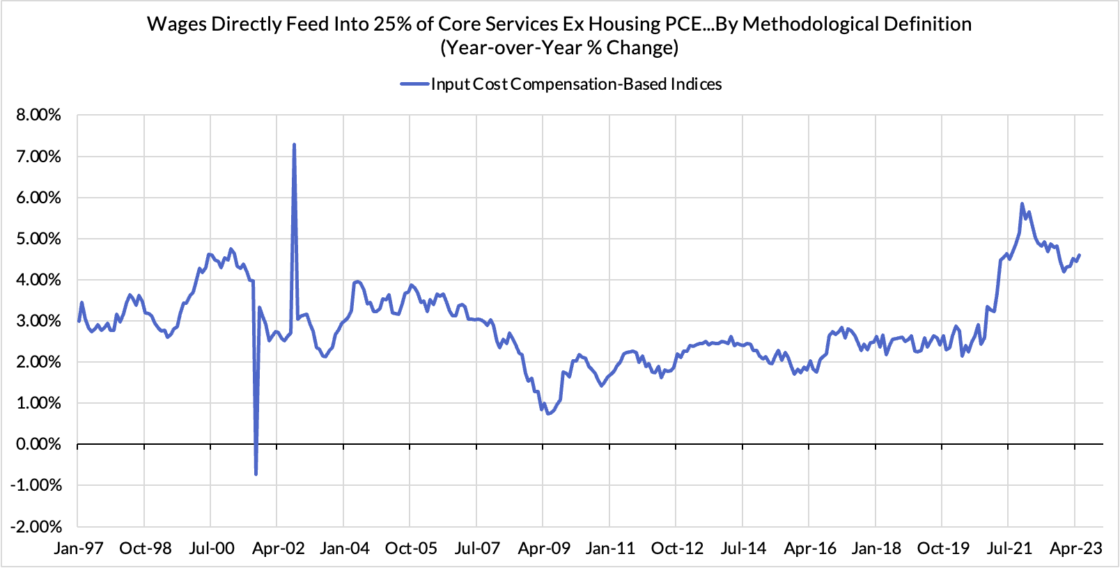 Even as wages are decelerating in the sectors that feed into "Core Services Ex Housing Consumption" activities, the scope for broader price relief has yet to substantially show. Chair Powell's most recent remarks suggest a pivot from a view of inflation driven primarily by labor costs in any direct sense. That would seem to be more reconcilable with what the data more obviously indicates right now.