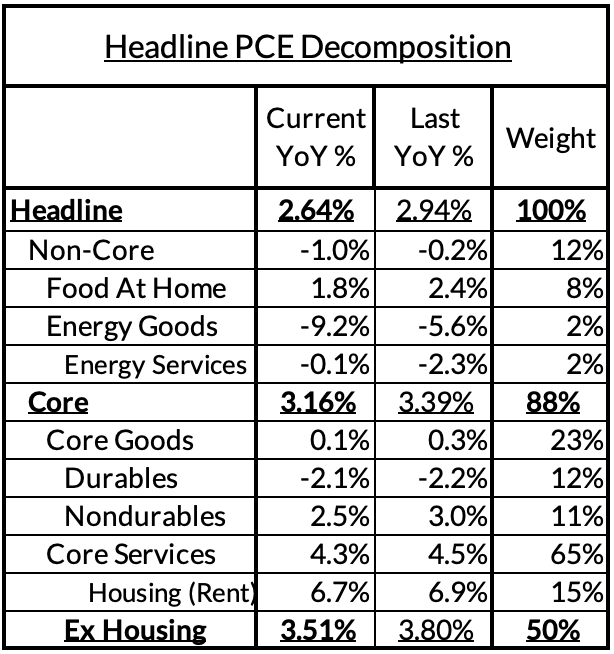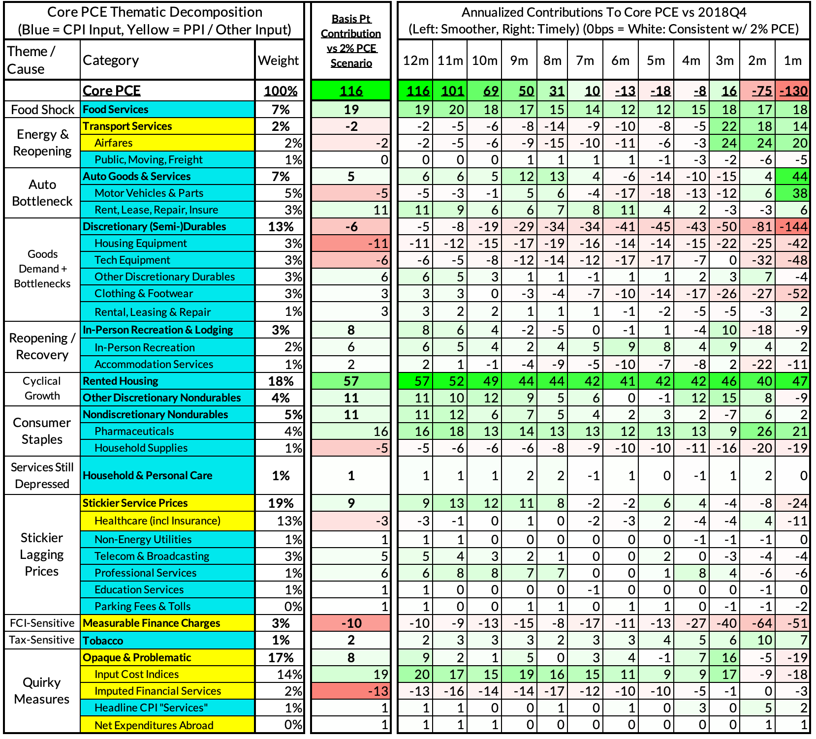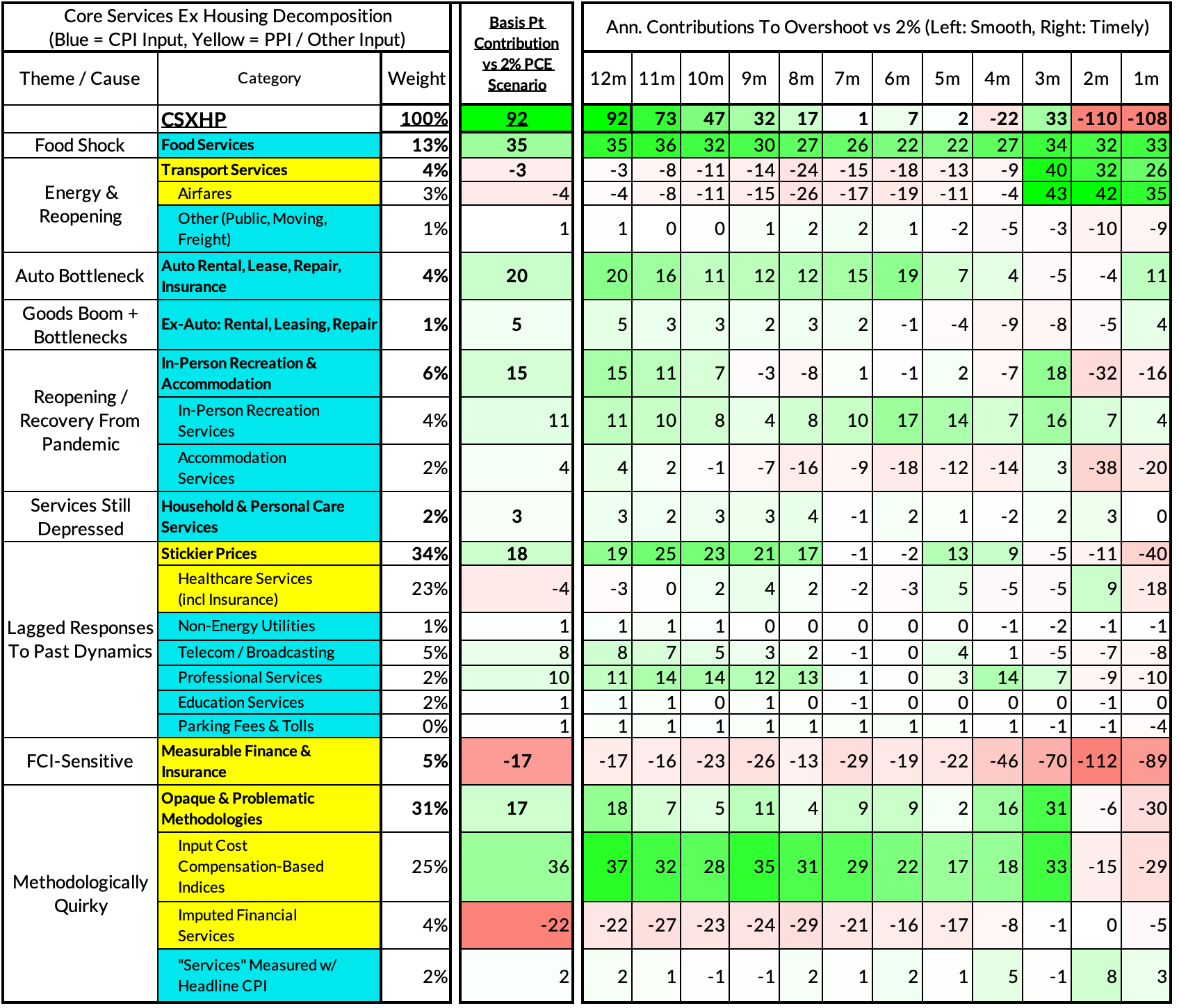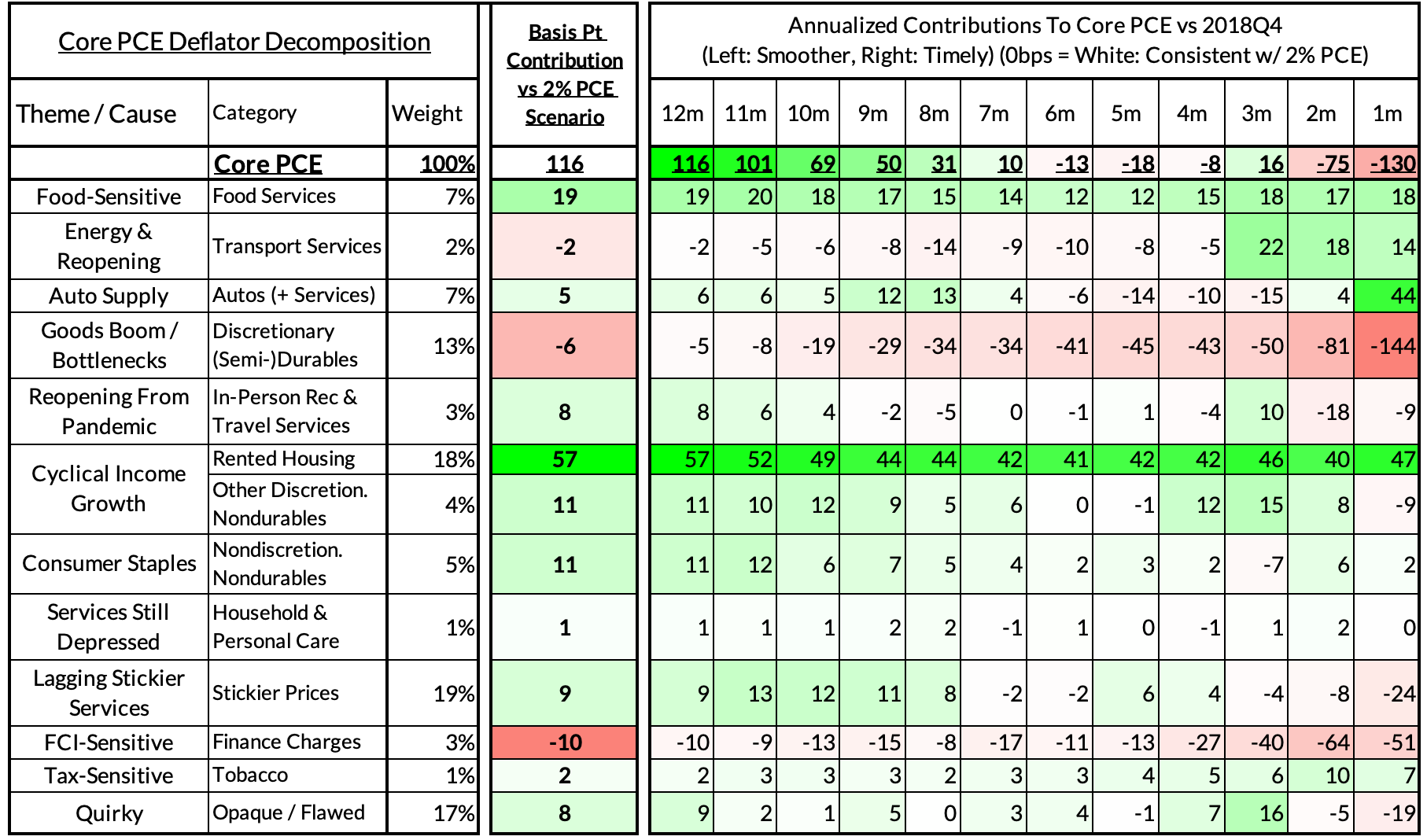 - Some oddball segments have offsetting effects (measured financial service charges now likely subtracted 10 basis points, while contributions from input cost indices and imputed financial services likely added 6 basis points to Core PCE vs 2%-consistent outcomes).