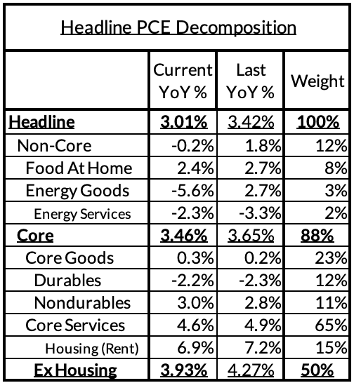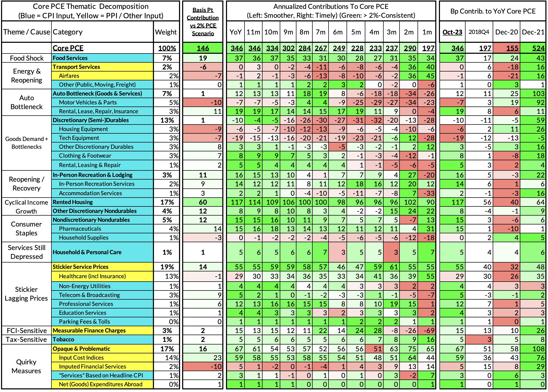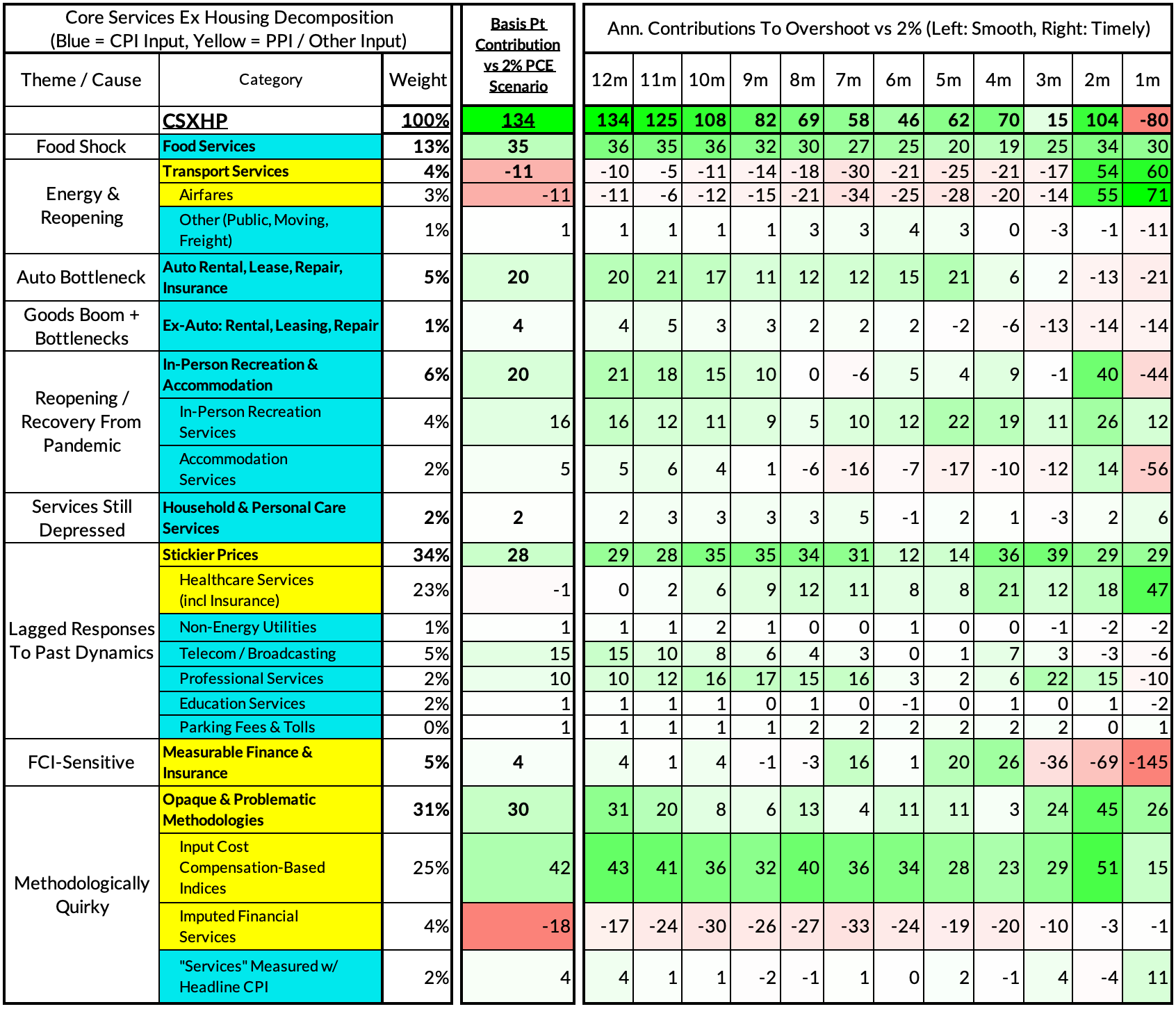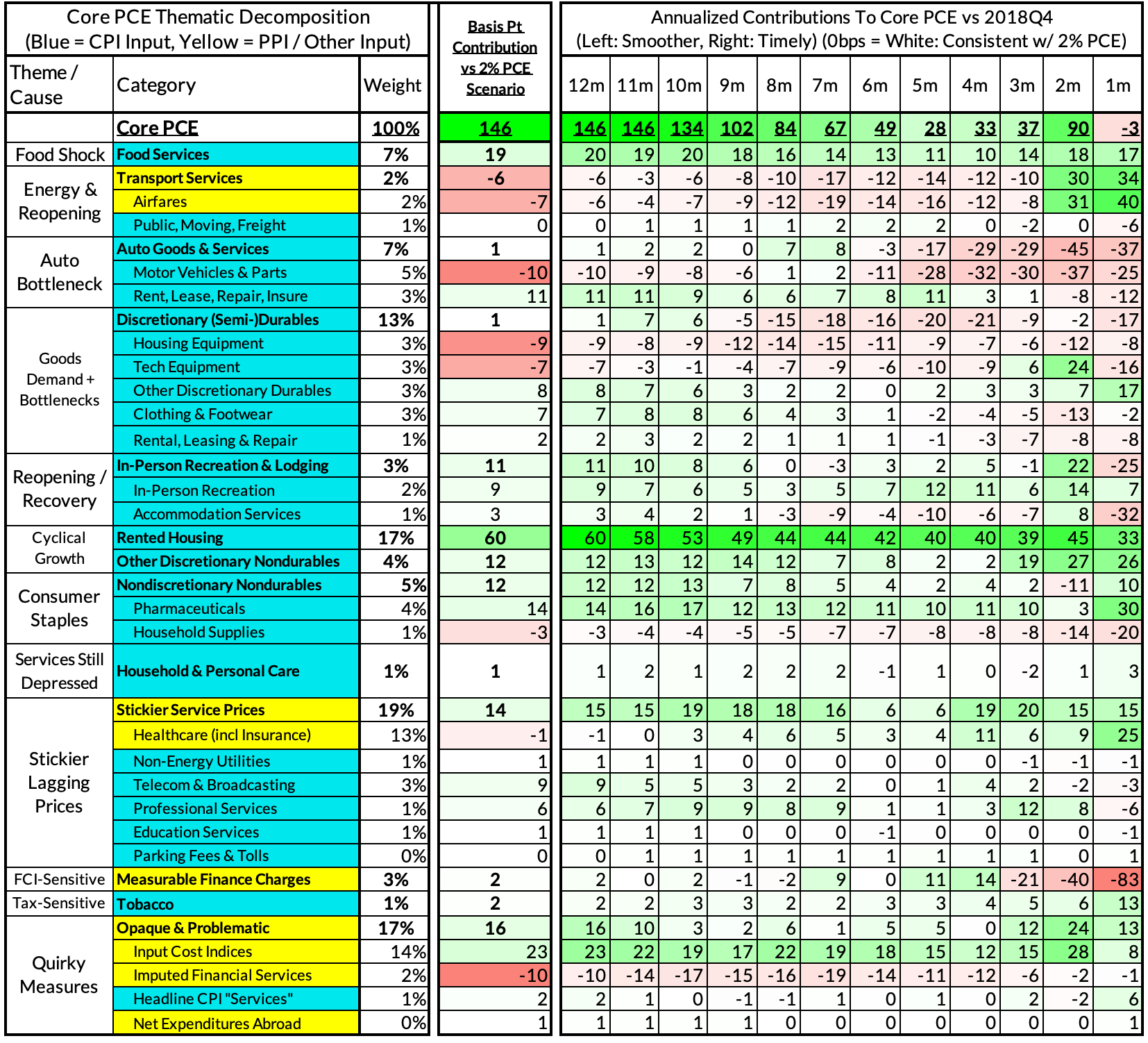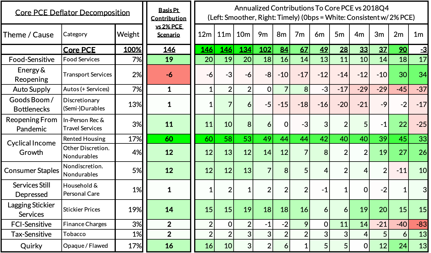 - Some oddball segments have offsetting effects (measured financial service charges now likely added 2 basis points, while contributions from input cost indices and imputed financial services likely added 13 basis points to Core PCE vs 2%-consistent outcomes).