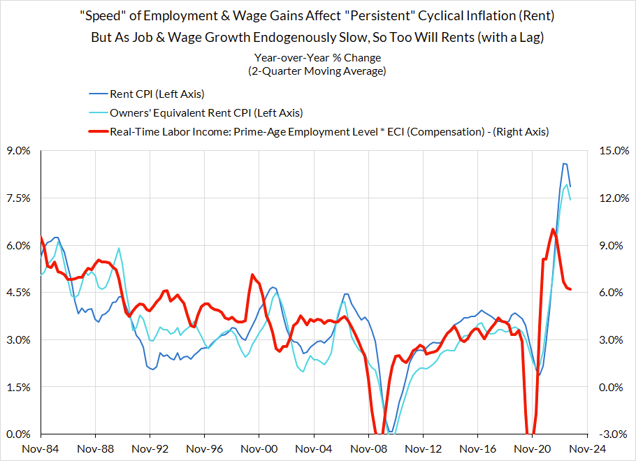 Right now Core PCE (PCE less food products and energy) is running at a 3.46% year-over-year pace as of October, 146 basis points above the Fed's 2% inflation target for PCE. That overshoot is disproportionately driven by catch-up rent CPI inflation in response to the surge in household formation (a byproduct of rapidly recovering job growth), which caused market rents to surge in 2021. Rent is contributing 60 basis points to the 146 basis point core PCE overshoot.