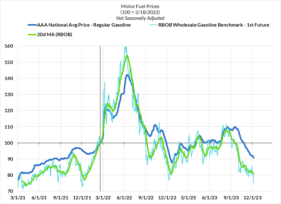 - Core goods deflation should continue, but expect it to be a shallow but persistent contributor to the disinflationary process. Price levels for a number of key core goods categories are still elevated and thus have room for sustained underperformance in a manner that supports achievement of the Fed's 2% target. The pace of this deceleration might be dismissed as transitory, but it likely will not be symmetric to the surge we saw in 2021 and 2022. Instead, we see good evidence and reason to believe that price transmission from key cost and supply chain shocks will be asymmetric. While prices rocketed higher as these shocks first hit, they will likely deflate at a slower pace (rockets vs feathers). For November, we are expecting less vehicles deflation than what has transpired in recent months, but there will be a deflationary resurgence in the coming few months given what the weekly wholesale auction data currently signals.