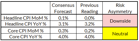 - Headline CPI is poised to grow slower (0.05%) than consensus (0.1%), while there are balanced risks around consensus expectations for core CPI.