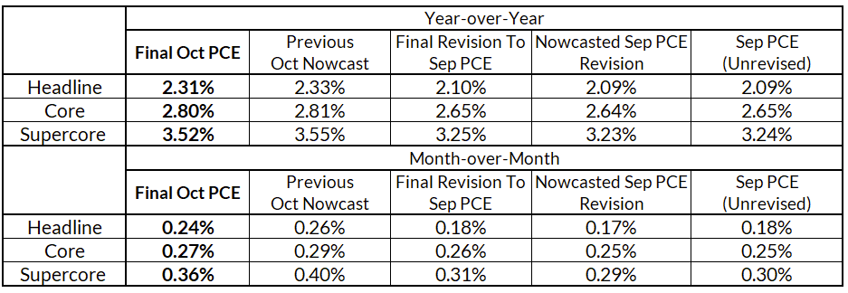 Our month-over-month nowcast for Core PCE were 2 basis points too high while our corresponding year-over-year nowcasts were just a basis point on the high side. All in all, we learned very little from the final release of the PCE data relative to what we learned after the October PPI release. The vast majority of the inflation overshoot stems from (1) housing lags, (2) equity market effects on financial service prices, and (3) and components that use wage-based input cost indices. We continue our baseline scenario that the Fed will cut only one more time over the next two meetings, with a bias towards a December cut and a January 2025 "pause."