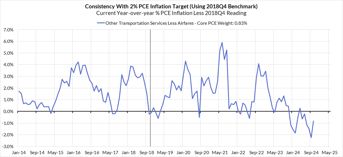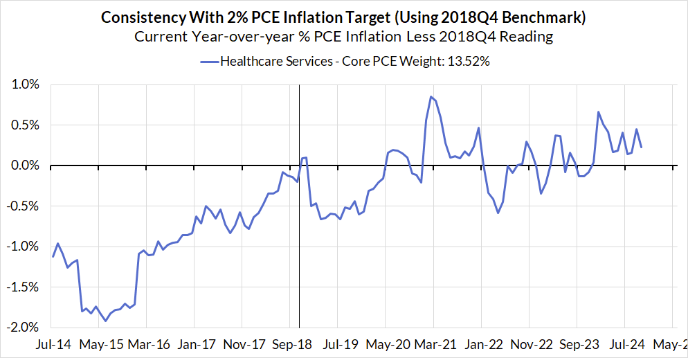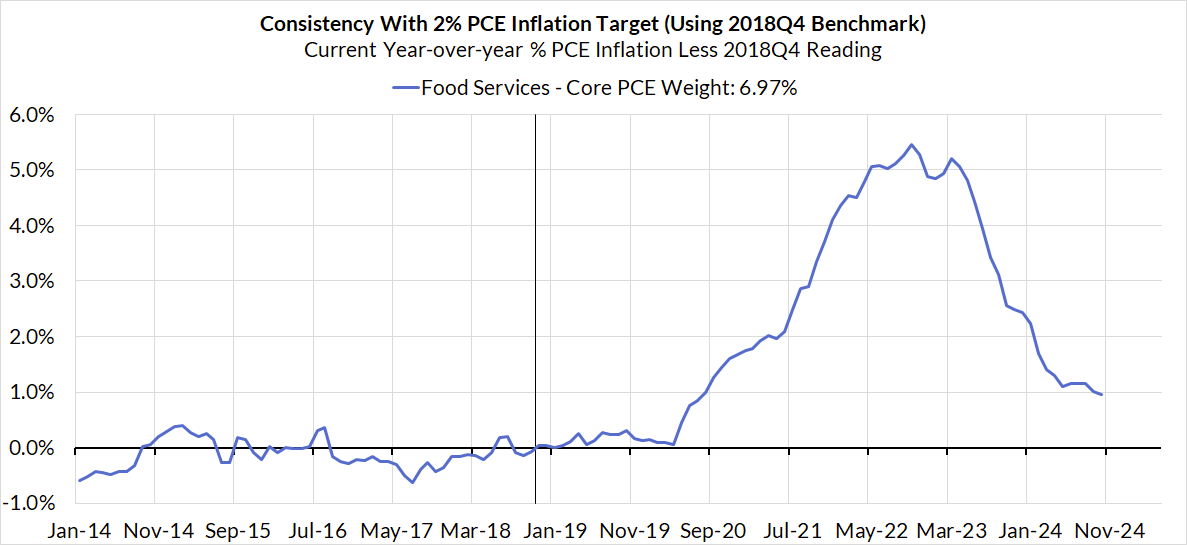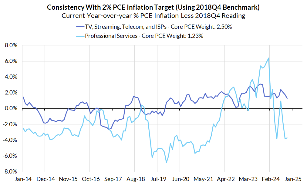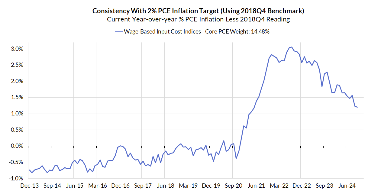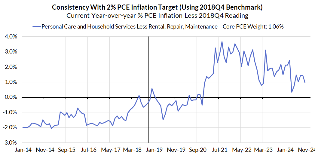 - Wage-based input cost indices (16bp overshoot contribution): There are also a number of PCE components for which no market price is visible and the "price" is actually an input cost index heavily weighted to wages. These components are still growing faster than what would normally be consistent with the 2% inflation target but, like wages, these measures are cooling (with a lag to wages).