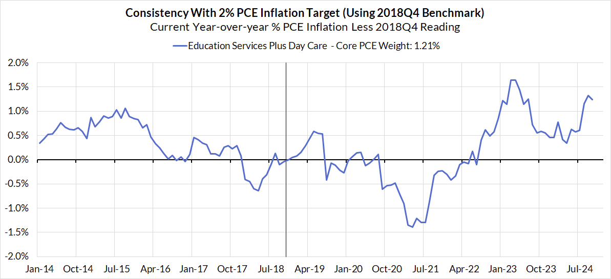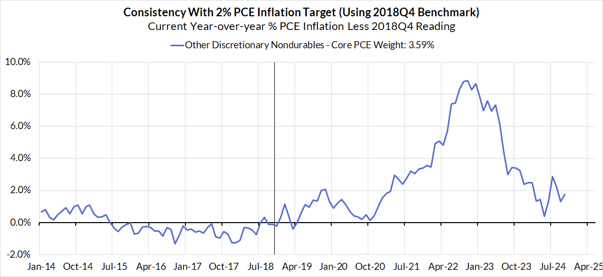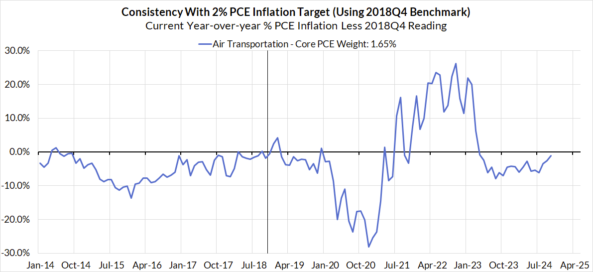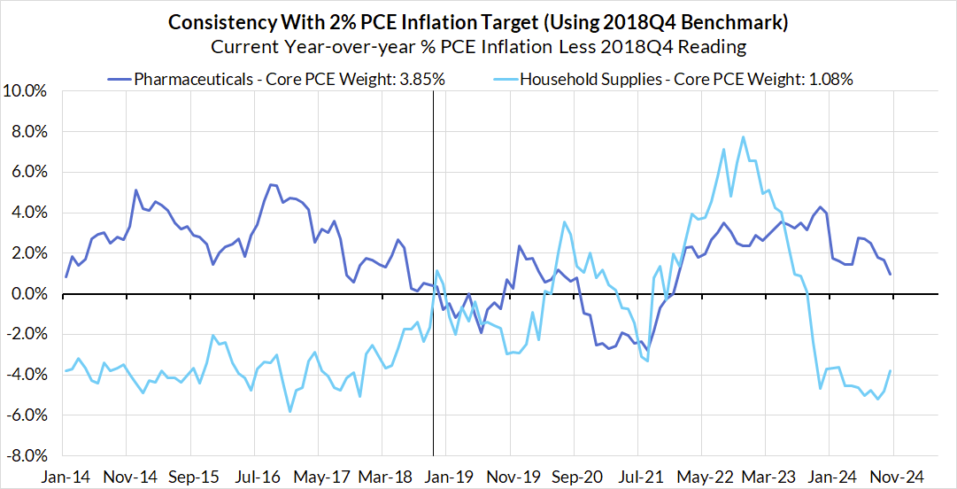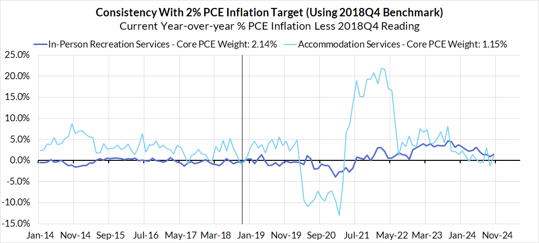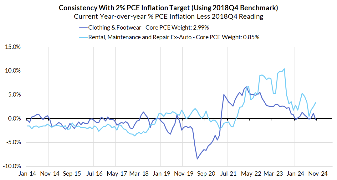 - Wage-based input cost indices (16bp overshoot contribution): There are also a number of PCE components for which no market price is visible and the "price" is actually an input cost index heavily weighted to wages. These components are still growing faster than what would normally be consistent with the 2% inflation target but, like wages, these measures are cooling (with a lag to wages).