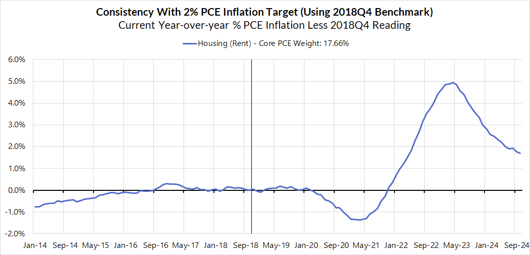 Right now Core PCE (PCE less food products and energy) is running at a 2.80% year-over-year pace as of October, 80basis points above the Fed's 2% inflation target for PCE. That projected overshoot is disproportionately driven by catch-up rent CPI inflation in response to the surge in household formation (a byproduct of rapidly recovering job growth) and market rents in 2021-22. Rent dynamics are contributing 30 basis points to the 80 basis point Core PCE overshoot.