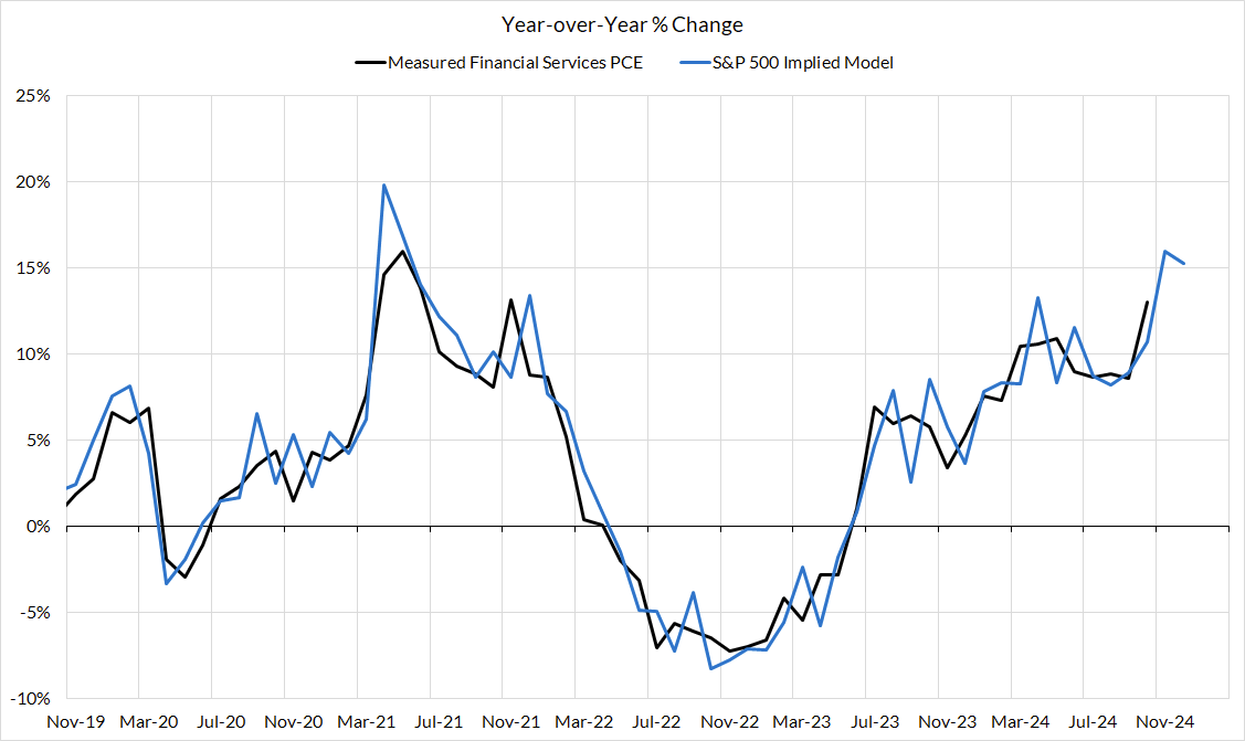 - Equity market effects (21bp overshoot contribution): The directly observed set of financial services prices in PCE are highly sensitive to equity market dynamics. In light of the impressive equity market run over the past 4-5 quarters, portfolio management inflation and measured financial services generally have run hotter than what would be consistent with the 2% inflation target and are likely to do so over the next two months as well. If the equity market runs sideways, or else corrects, the greater the odds of achieving 2% Core PCE. A continued run-up in the equity market would make it more difficult for the Fed to hit its inflation goals in the near term. The equity market effect tends to lag realized equity market dynamics by 1-2 months.
