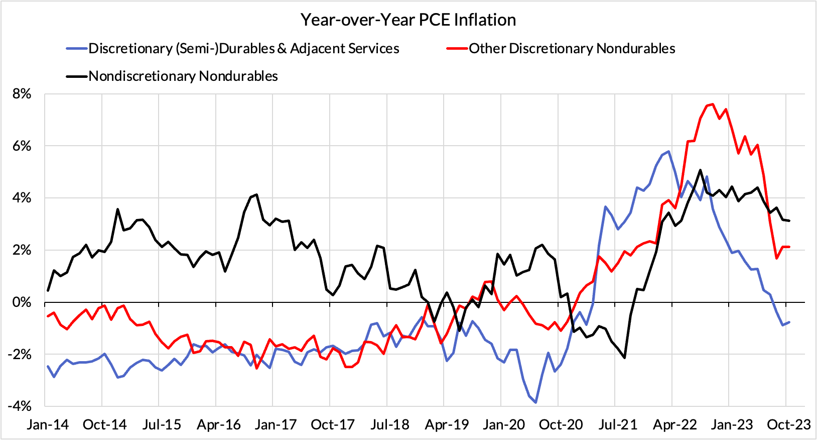 - Year-over-year Core PCE readings will finish 2023Q4 around 3.4%, possibly even falling to 3.3%. That is 30-40 basis points below the Fed's September projection.