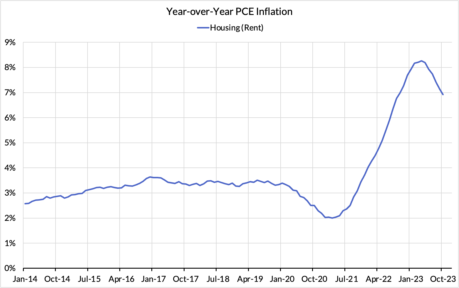 Right now Core PCE (PCE less food products and energy) is running at a 3.46% year-over-year pace as of October, 146 basis points above the Fed's 2% inflation target for PCE. That overshoot is disproportionately driven by catch-up rent CPI inflation in response to the surge in household formation (a byproduct of rapidly recovering job growth), which caused market rents to surge in 2021. Rent is contributing 60 basis points to the 146 basis point core PCE overshoot.