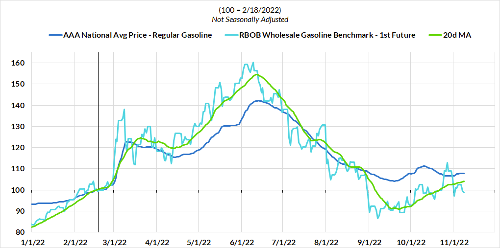 - Automobiles: Private weekly wholesale price data continues to show signs of prices capitulating at auctions, but the retail data is declining more slowly (arguably a similar result to when consumers began to see gasoline prices decline later than what was visible at the wholesale level). We should soon see prices decline at an elevated pace given what we already know from the wholesale data and how substantially prices overshot to the upside in 2021-22. Relief here seems to be a function of help from the supply and demand side but it's worth noting that new vehicle sales actually jumped in October and production is beginning to recover.