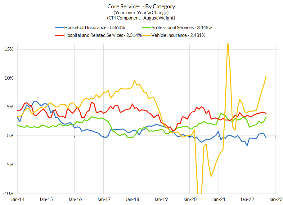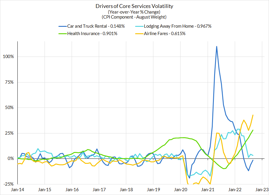 - Relief From Other Services? Airfares, lodging, and vehicle insurance were all substantial contributors to inflation over the past 12 months but are showing increasing signs of normalization over the coming months. Meanwhile, car and truck rental rates are starting to decline and could still decline further if we begin to see used car prices fall substantially (and new car prices subsequently follow).