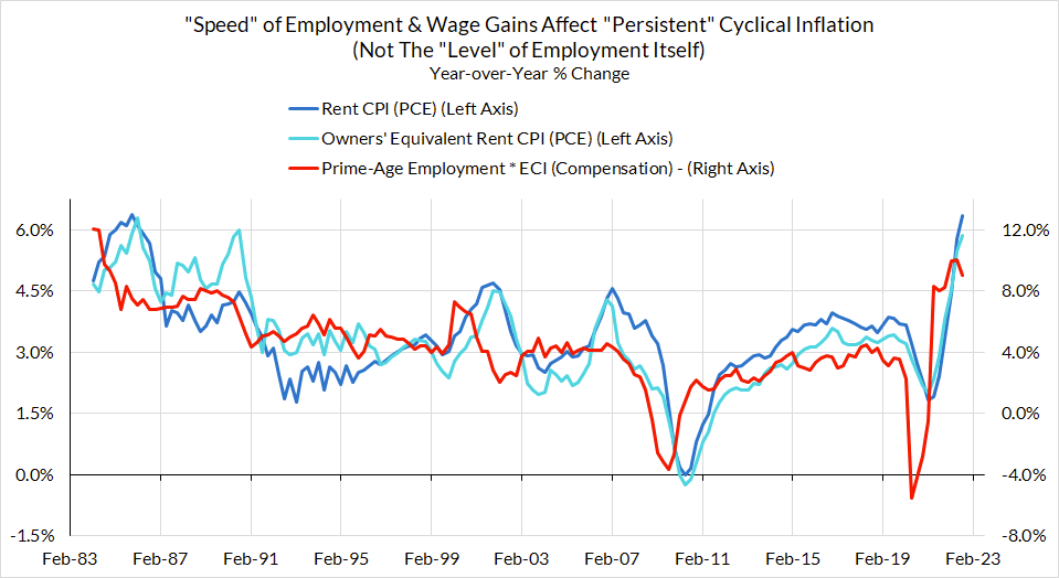 - Health Insurance Disinflation? What has been a sneaky huge inflationary tailwind to core services CPI inflation (but not its PCE analogue) is the health insurance CPI. Due to some quirky methodology that you should listen to Omair Sharif explain on Odd Lots, health insurance was a steady contributor to inflation acceleration in 2022 but is likely to correct downwards over the subsequent 12 months as updated source data resets the trend here.
