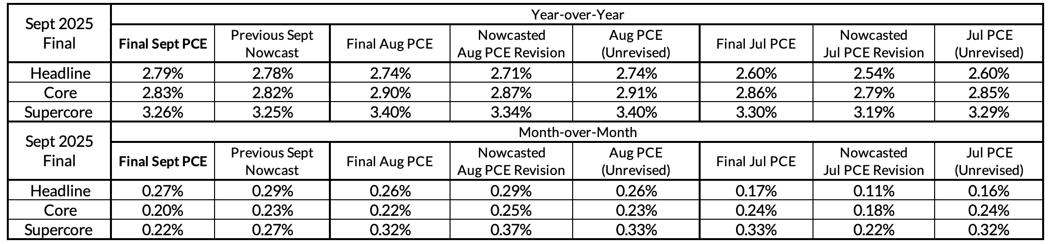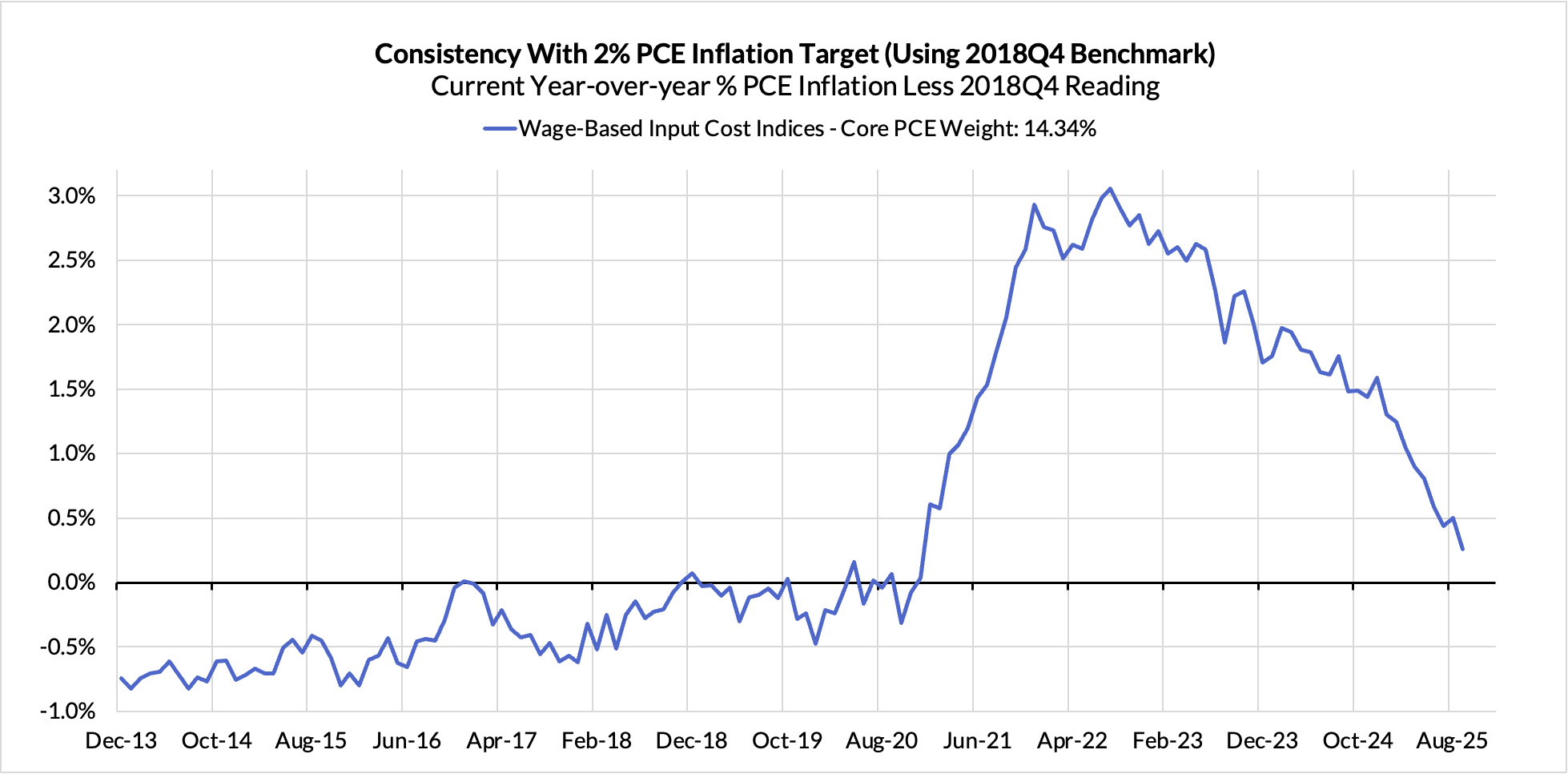 Our year-over-year nowcasts were a rounding error away from perfection for September, but the incidence of the monthly changes and revisions were slightly more disjointed. The major sources of deviation involved downside developments among wage-based input cost indices, which are non-market estimates that disinflate with a lag relative to measures of labor market tightness.