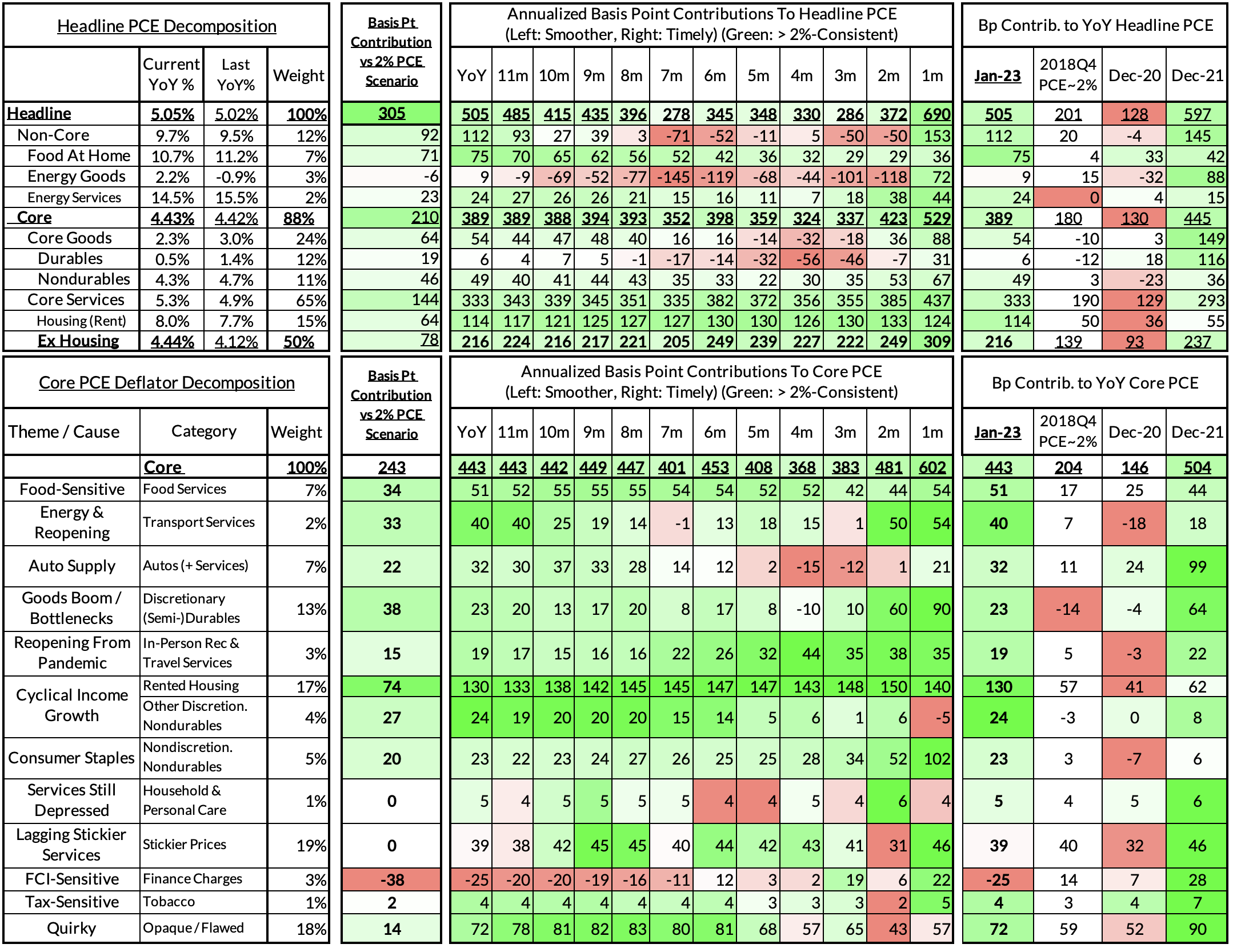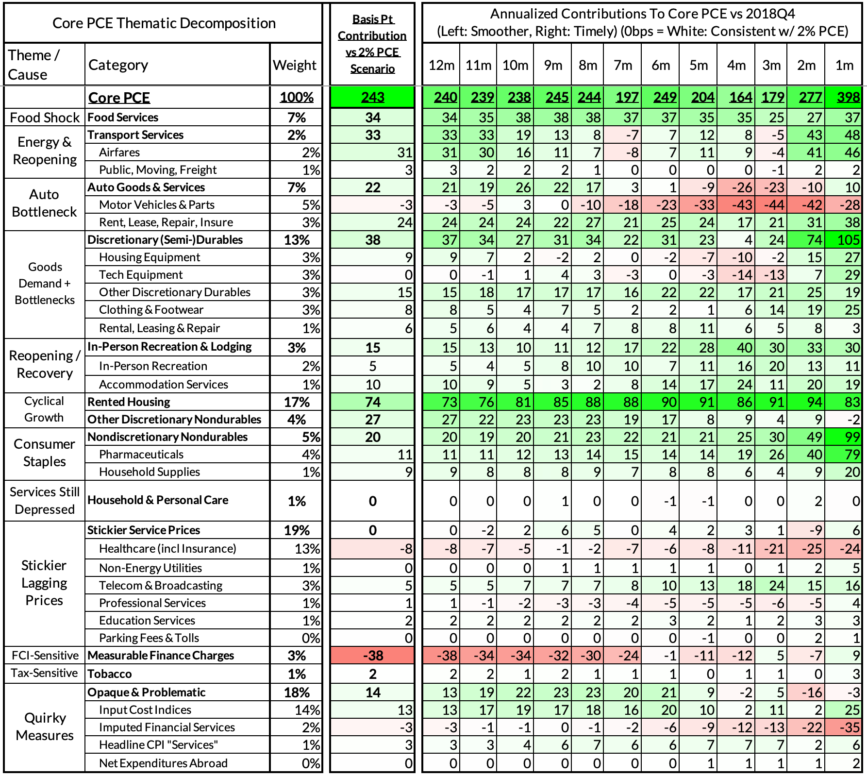 We're doing the dirty work of translating inflation inputs into PCE in real-time for you. There are some dark parts of PCE not related to CPI and PPI; we'll be back with an update when PCE is released. The associated heatmaps are dense, but they aim to give a holistic view of how individual inflation components reflect major inflation themes. Critical to us is the comparison of current component performance vs what transpires when inflation is running at 2%.