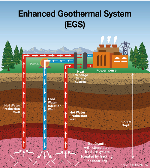 Where conventional systems require natural reservoirs with high permeability, enhanced geothermal systems (EGS) designs use horizontal drilling and hydraulic fracturing to create artificial permeability. By breaking open fissures in the subsurface, water can circulate between injection wells and production wells. Essentially, fracking creates the reservoir.