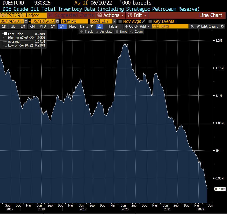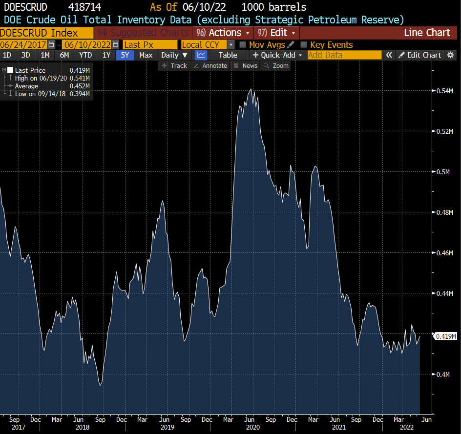 If we were seeing a buildup in crude oil inventories against capacity constraints at refineries, then boosting crude oil supplies would indeed be pushing on a string. The risk of filled storage ("tank tops") would force discounting—as we saw in 2020Q2—but that discounting would not pass through to the price at the pump. This is not the case today: inventories are currently very low and the supply picture remains fragile.