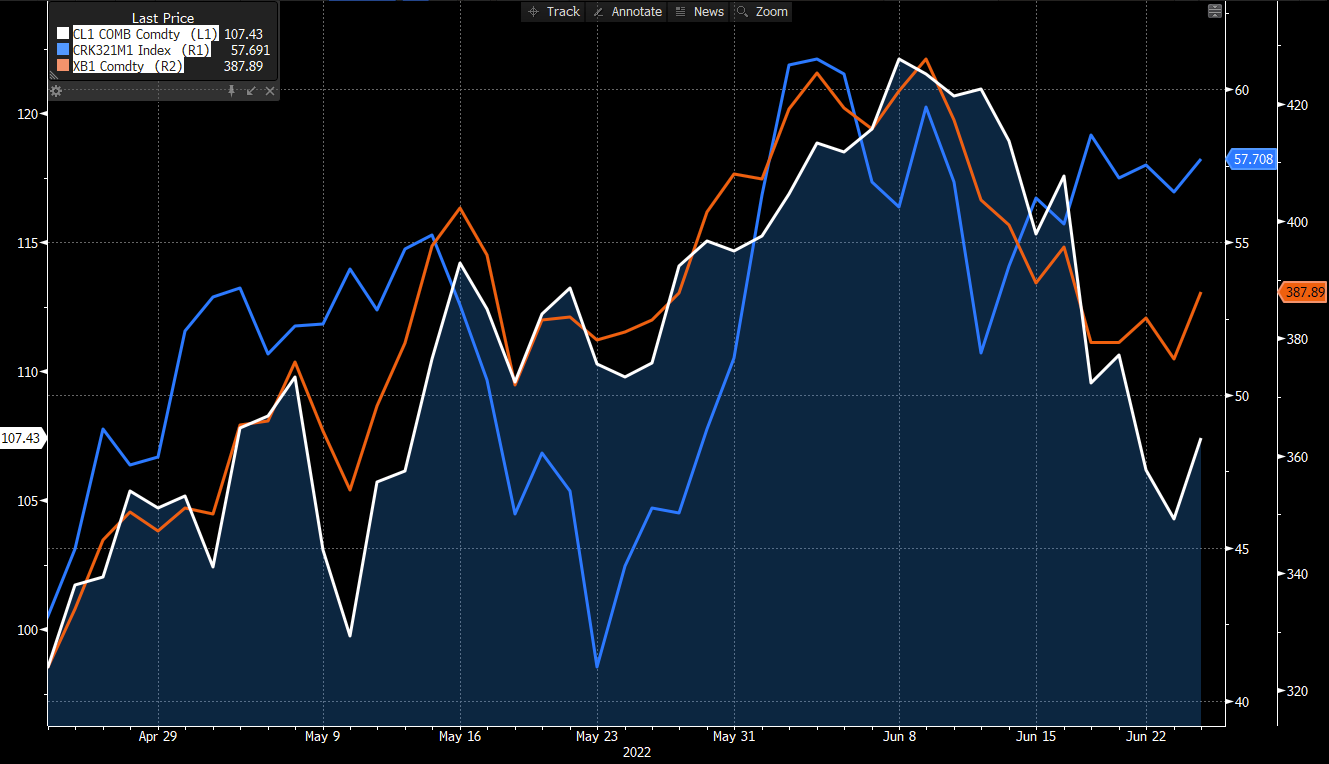 There's a related argument that, amidst a highly bottlenecked situation among refiners, prices are simply rising to the point of demand destruction. Under that assumption, any input cost relief for refiners in the form of lower crude oil prices would not be passed through to consumers. The recent evidence clearly cuts against this view. Crude oil prices have fallen, refiners' margins ("crack spreads") have been stable, and much of the input cost benefit has passed through to final gasoline prices.