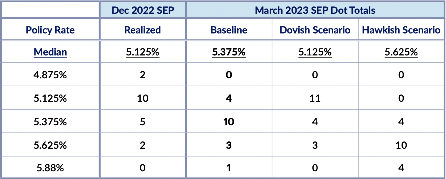 Baseline Scenario: Terminal rate projections (2023 dots) rise another 25 basis points to 5.375% at the March FOMC meeting. Job growth has proven resilient (less than expected recession risk) and January PCE inflation data is likely running hotter than the Fed projected in December. We are also baking in the assumption that February labor market and CPI data will come in stronger than consensus, adding to the likelihood that some FOMC members will lift their dot as a result.