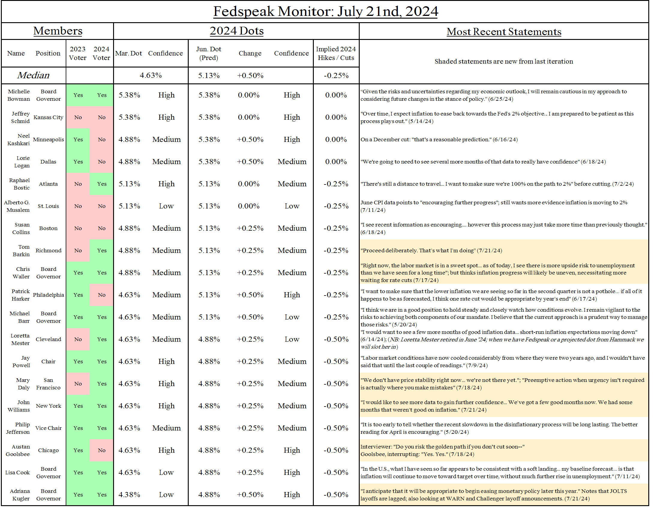 Another week of Fedspeak hearing from the dovish side of the Committee, who are mostly pushing back on July (except Goolsbee). Most forcefully amongst these is Daly, who focused most of her monetary policy remarks on the risks to cutting too early ("We have to balance the cost of acting fast and being wrong.") and actively rejected taking preemption seriously ("Preemptive action when urgency isn't required is actually where you make mistakes"). Williams too seems happy to wait until September, saying there are good reasons to wait (given the two months of inflation data they'll get in between those meetings).