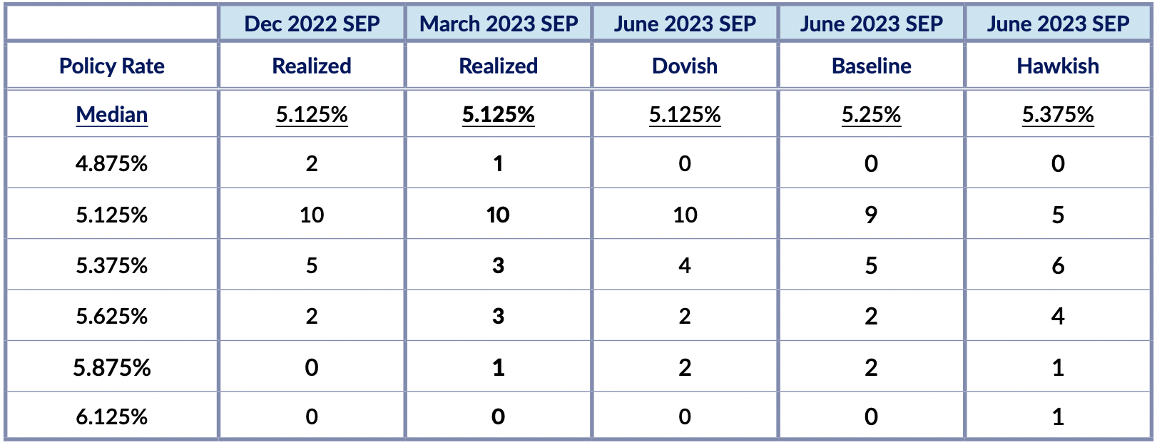 Vice Chair Nominee Phillip Jefferson offered the clearest statement of the logic behind these two choices, stating “a decision to hold our policy rate constant at a coming meeting should not be interpreted to mean that we have reached the peak rate for this cycle.” The pandemic has seen some real acrobatics in terms of Fed communications, which may be coming to a close with this week’s increased clarity about the 2023 terminal rate. We have moved our base-case median dot from 5.25% to 5.375% and eliminated the dovish scenario put forward last week.