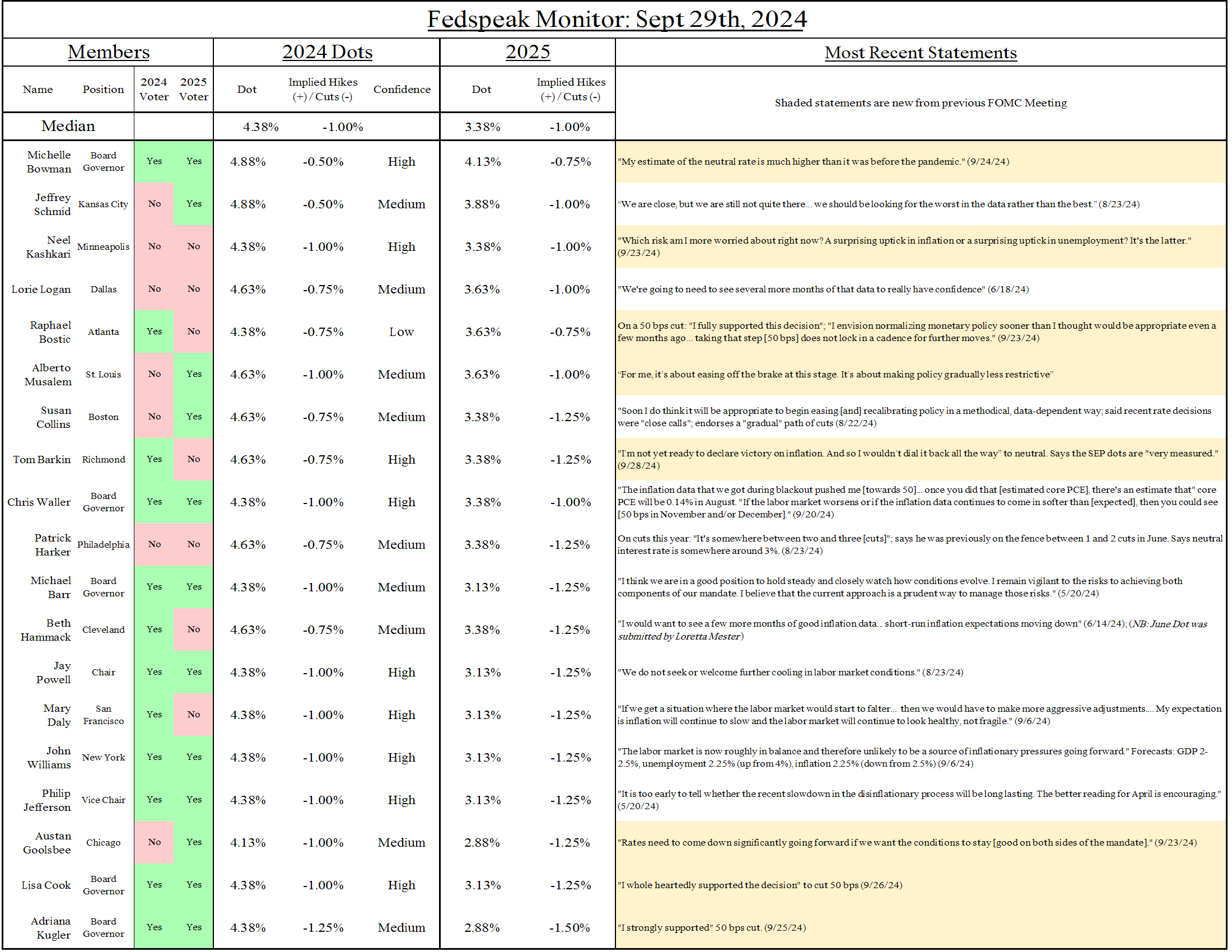 Musalem and Barkin are less in a hurry to lift restrictions. Musalem is worried that the economy would react "very vigorously" to financial conditions loosening and thinks the risks between over and underheating are "roughly balanced." Unsurprisingly, Cook, Goolsbee, and Kugler came out in strong support of the 50 bps cut move.