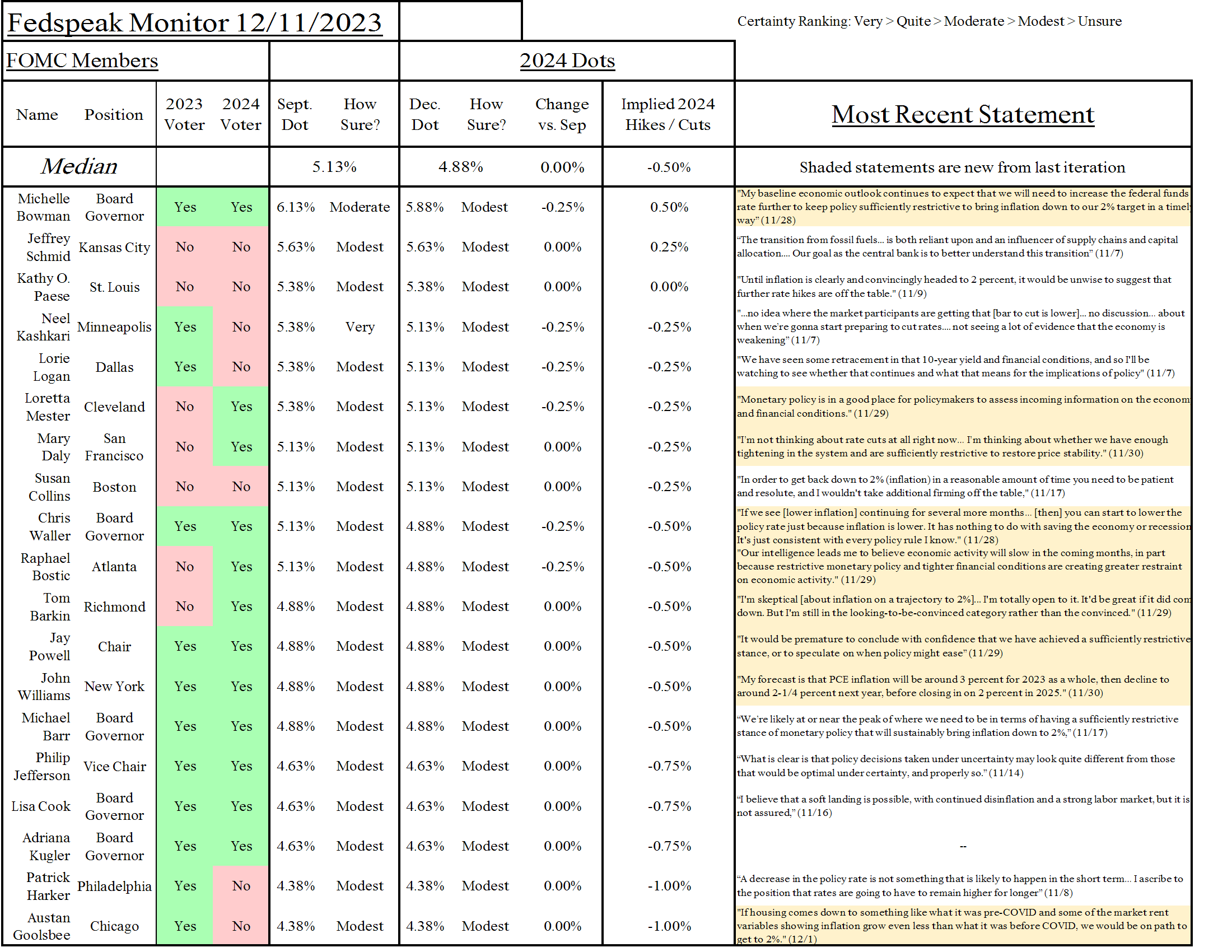 - Not much movement in the other projections. Real GDP growth and unemployment projections will probably not move very much, given that recent developments there have been consistent with the previous projection. The committee’s ability to keep talking about maintaining policy at this level requires them to still maintain a similar projection of inflation; we do not expect the inflation projections to change much either. Even though we have the median 2024 dot dropping to 4.875%, note that the median dot in September was barely 5.125%, with 9 of 19 members at 4.875% or under. Given their recent comments, we’re penciling in Bostic and Waller at 4.875%, enough to move the median.
