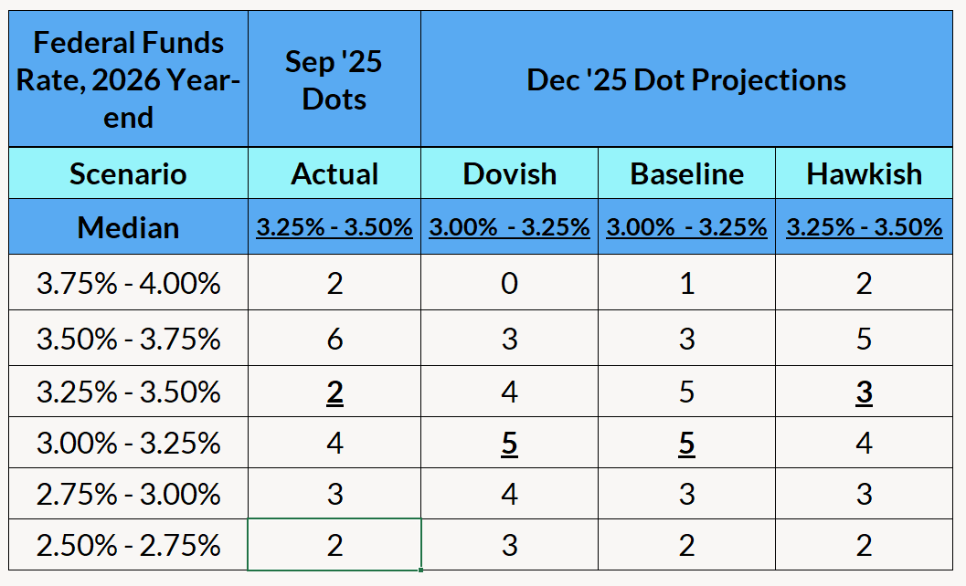 Even after this week’s meeting, the disagreement amongst the Committee should continue into 2026. The disagreement amongst FOMC members is as much about the destination of the neutral rate as it is how restrictive policy should be. Because of this, we expect the dots for 2026 to range from 3.75% to 4.00% (one hike) to 2.50% to 2.75% (4 cuts), with clustering around 3.00% to 3.50%. Our baseline case has the median projection at 2 more cuts in 2026, but with nine members projecting no more than one cut.