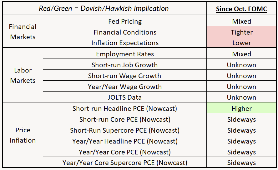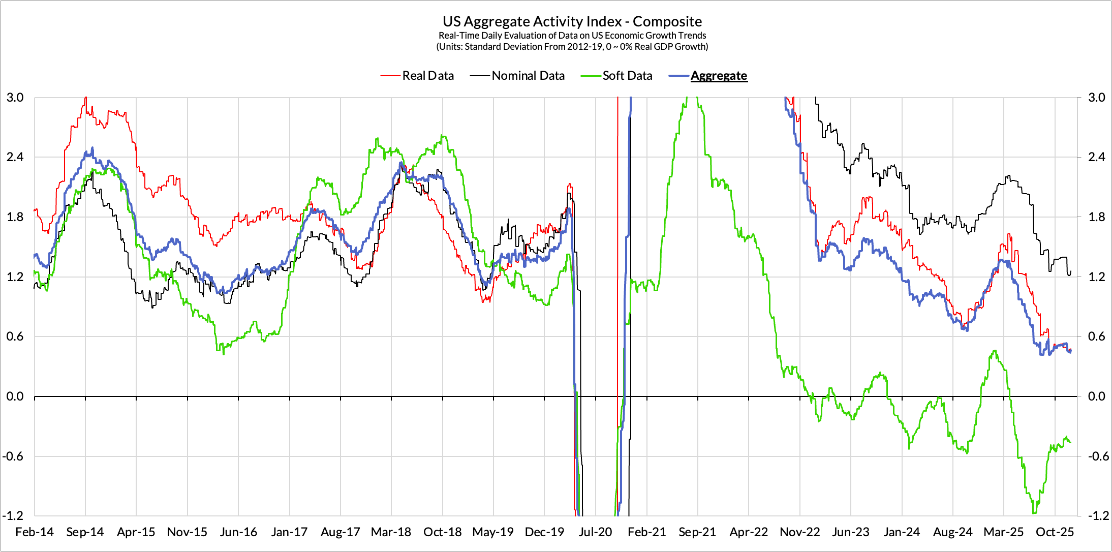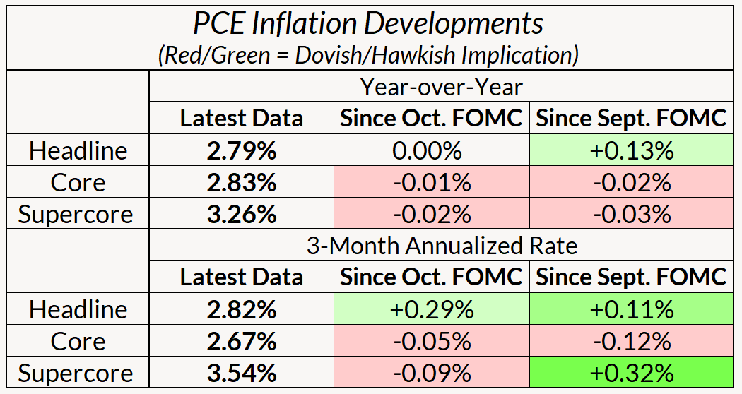The intermeeting period has been notable due to the lack of data developments as surveys were either not collected or significantly delayed during the government shutdown. We will only have stale and significantly-delayed inflation and jobs reports for September. The September jobs data—already out-of-date—showed strong payroll gains but also an increase in the unemployment rate to 4.44%, not far from the 4.5% median FOMC projection from the September FOMC meeting.