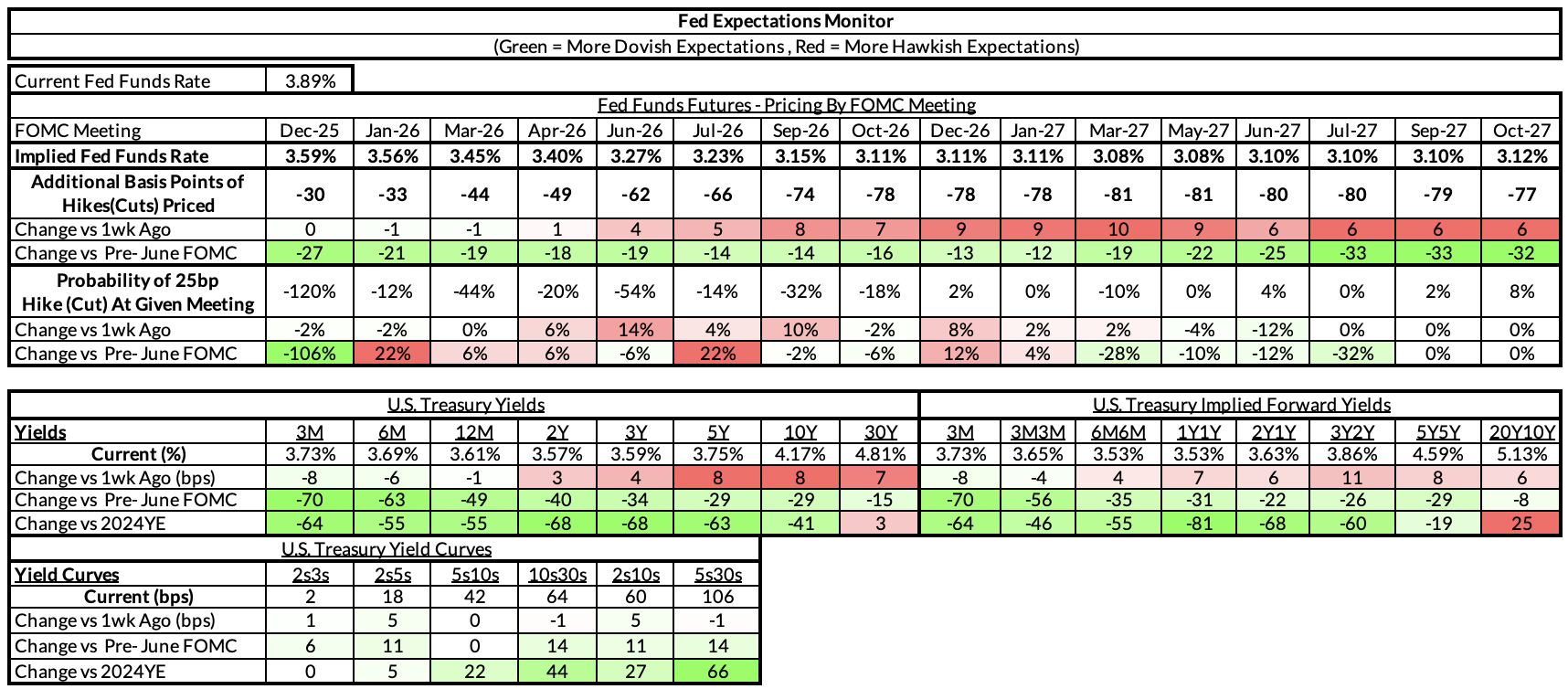 In the absence of the usual flow of data, the Fedspeak has seen hawks and doves alike retrench their positions. Regional bank presidents, who generally see higher neutral rates and are more concerned about inflation, have thrown cold water on supporting further rate cuts, while Board members (plus Williams and Daly) have been confident about tariff effects on inflation being transitory and the labor market being more shaky.