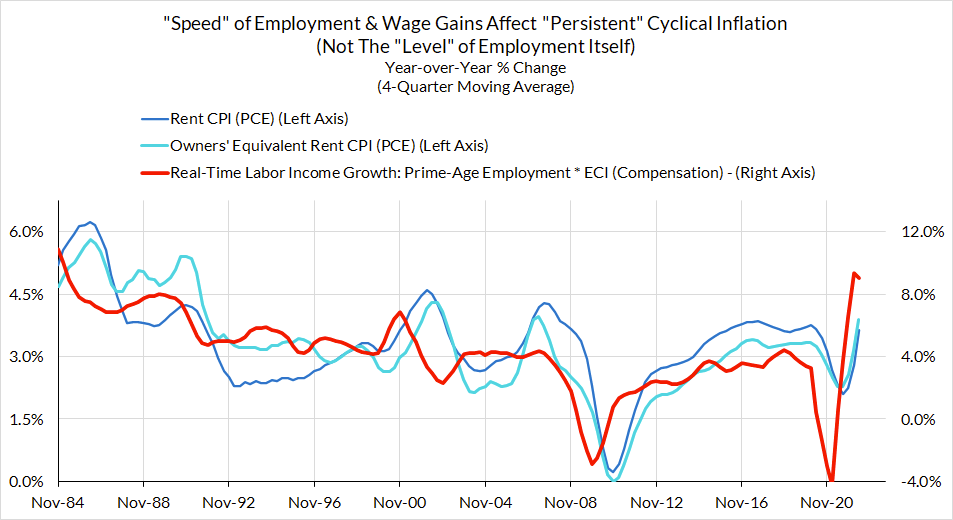 - Lagged inflation dynamics that are functions of either 1) past/ongoing commodity price increases (e.g. the effect of natural gas prices on energy services) or 2) past labor market dynamics (e.g. the surging recovery in jobs and wages feeding into rent and OER)