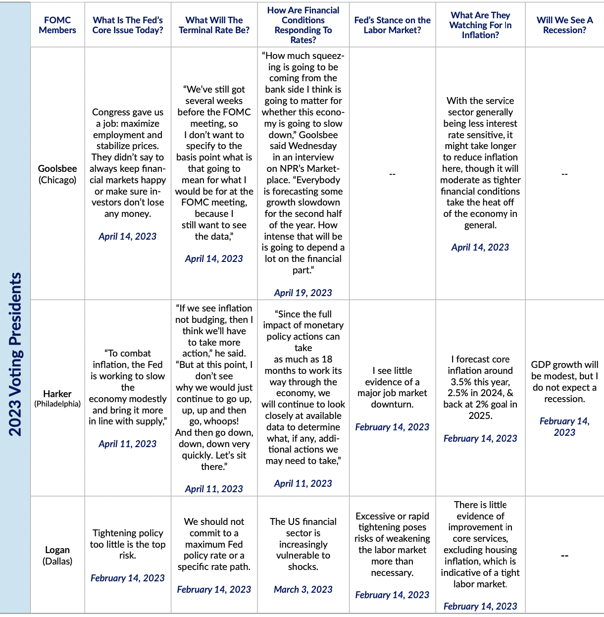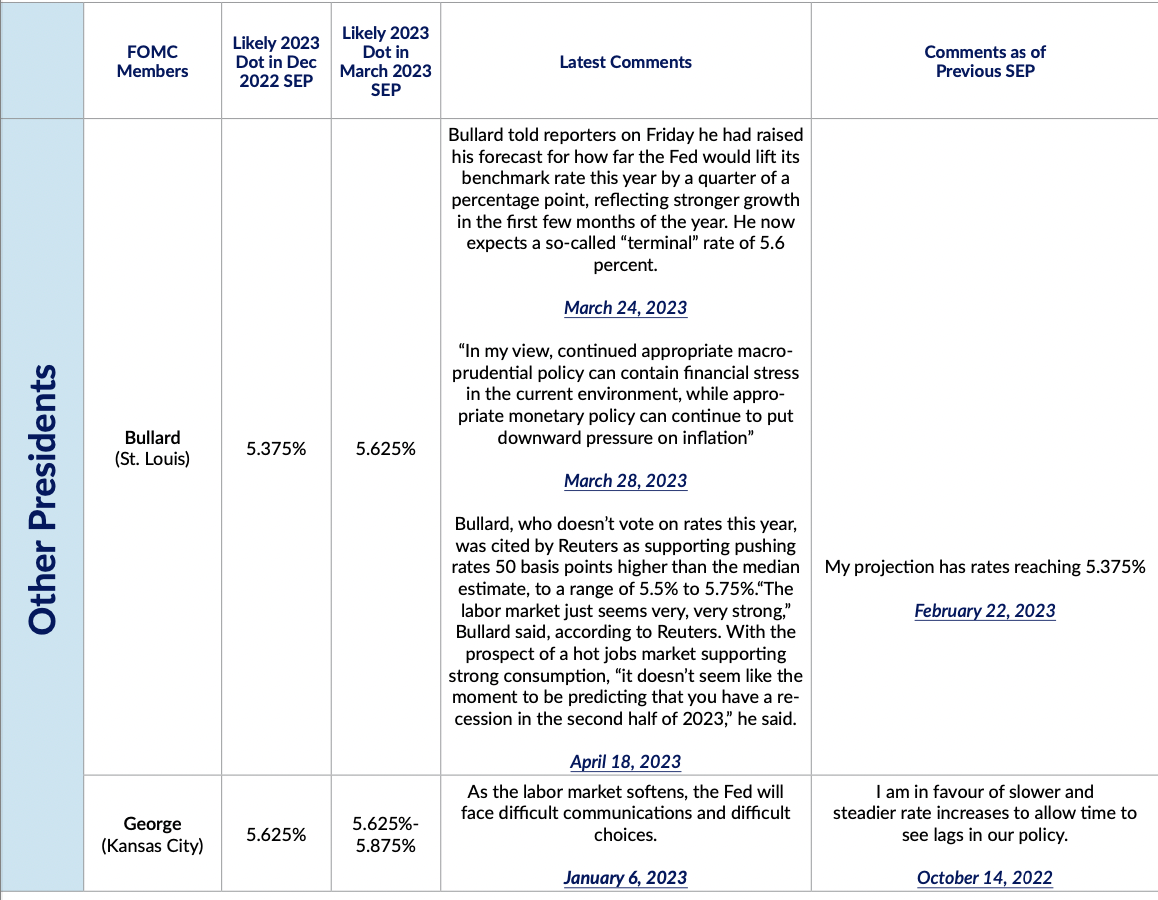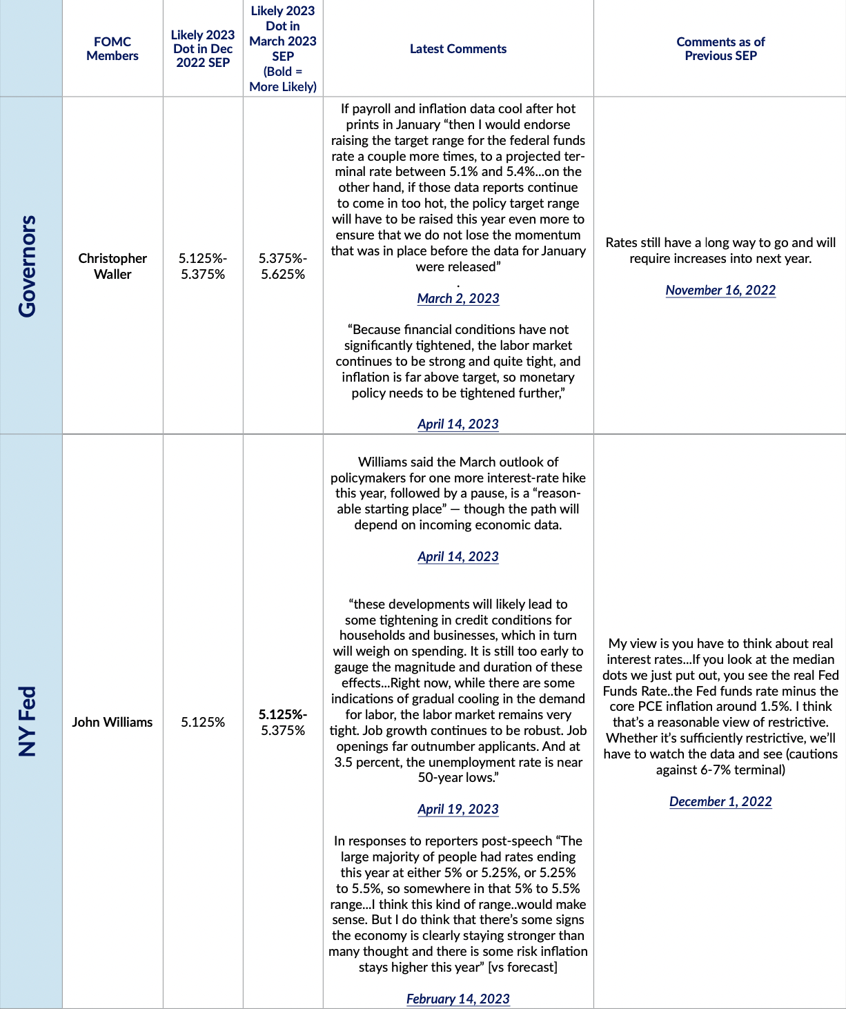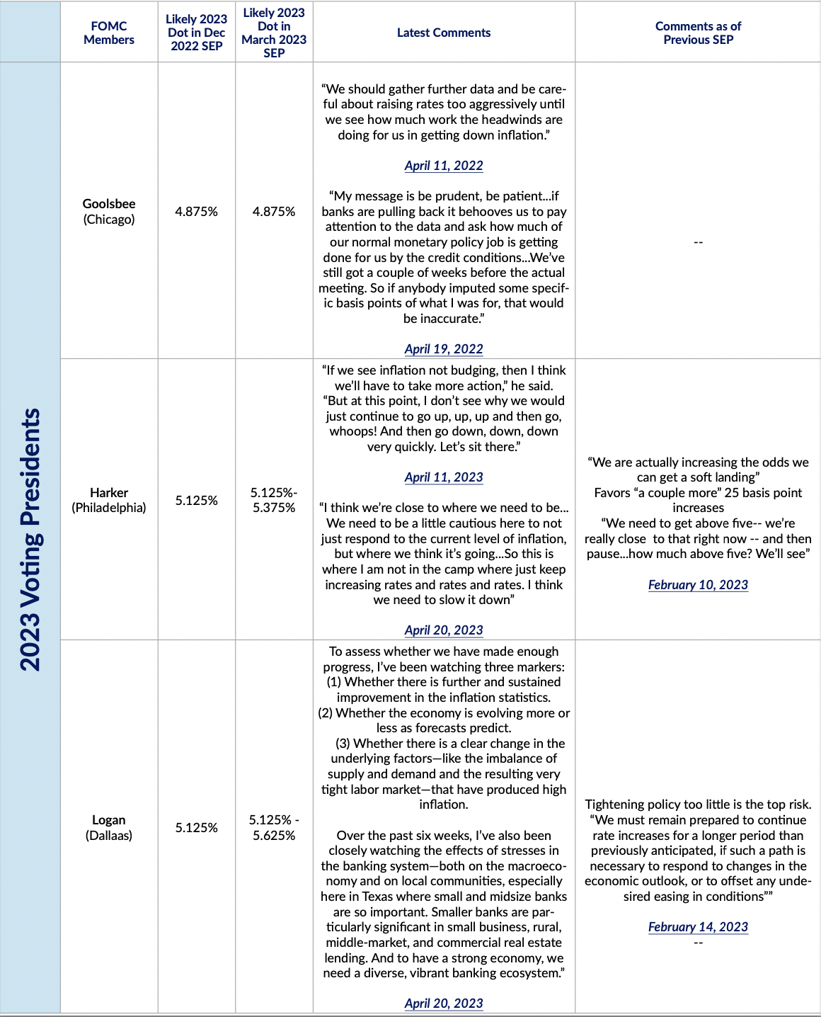 - Not out of the woods on bank credit tightening by any stretch: The Fed staff that support monetary policy decisions are not bank analysts. They, along with FOMC members, tend to only see these dynamics from a top-down perspective...recognizing risks only after they are publicly obvious. If you keep getting blindsided by banking challenges, the rational response is to proceed with greater caution. Former regional Fed presidents Eric Rosengren and Robert Kaplan have publicly reflected that sentiment more vocally in recent weeks. Fedspeak suggests that for many non-academic-macroeconomist FOMC members, the inclination to tread lightly and stop hiking after May is strong. For these members, they are most keen to avoid getting mugged by banking dislocations. Given the attenuated nature through which financial system transmits the Fed's policies to the real economy, they probably will keep being caught offsides. Claims that the Fed can manage financial stability independent of monetary policy decisions will keep coming sporadically under pressure.