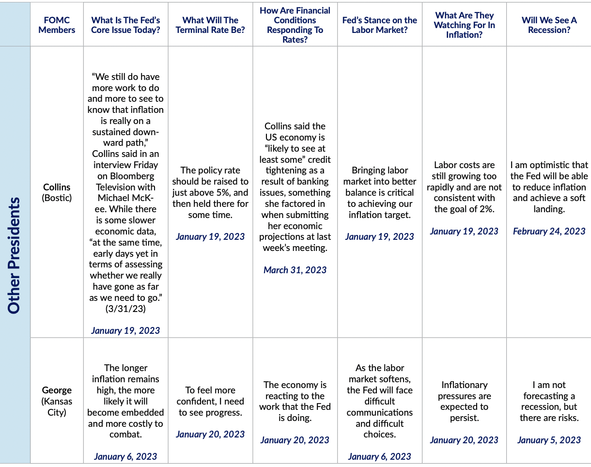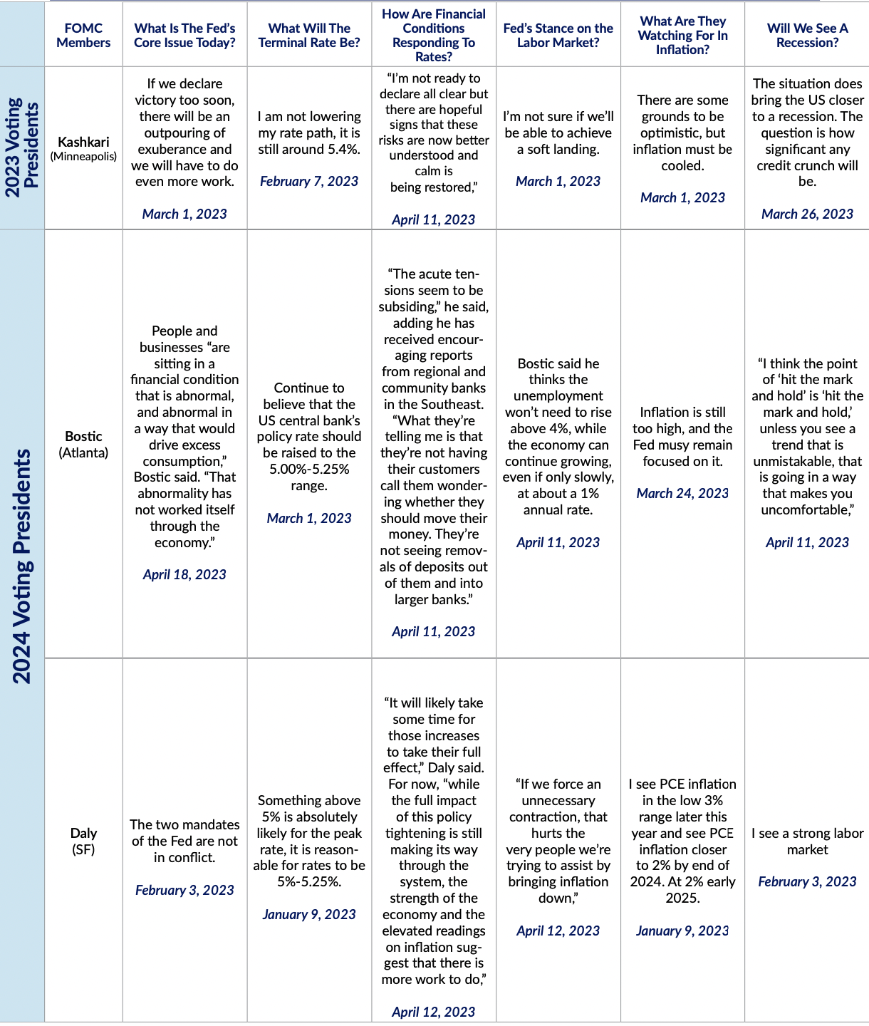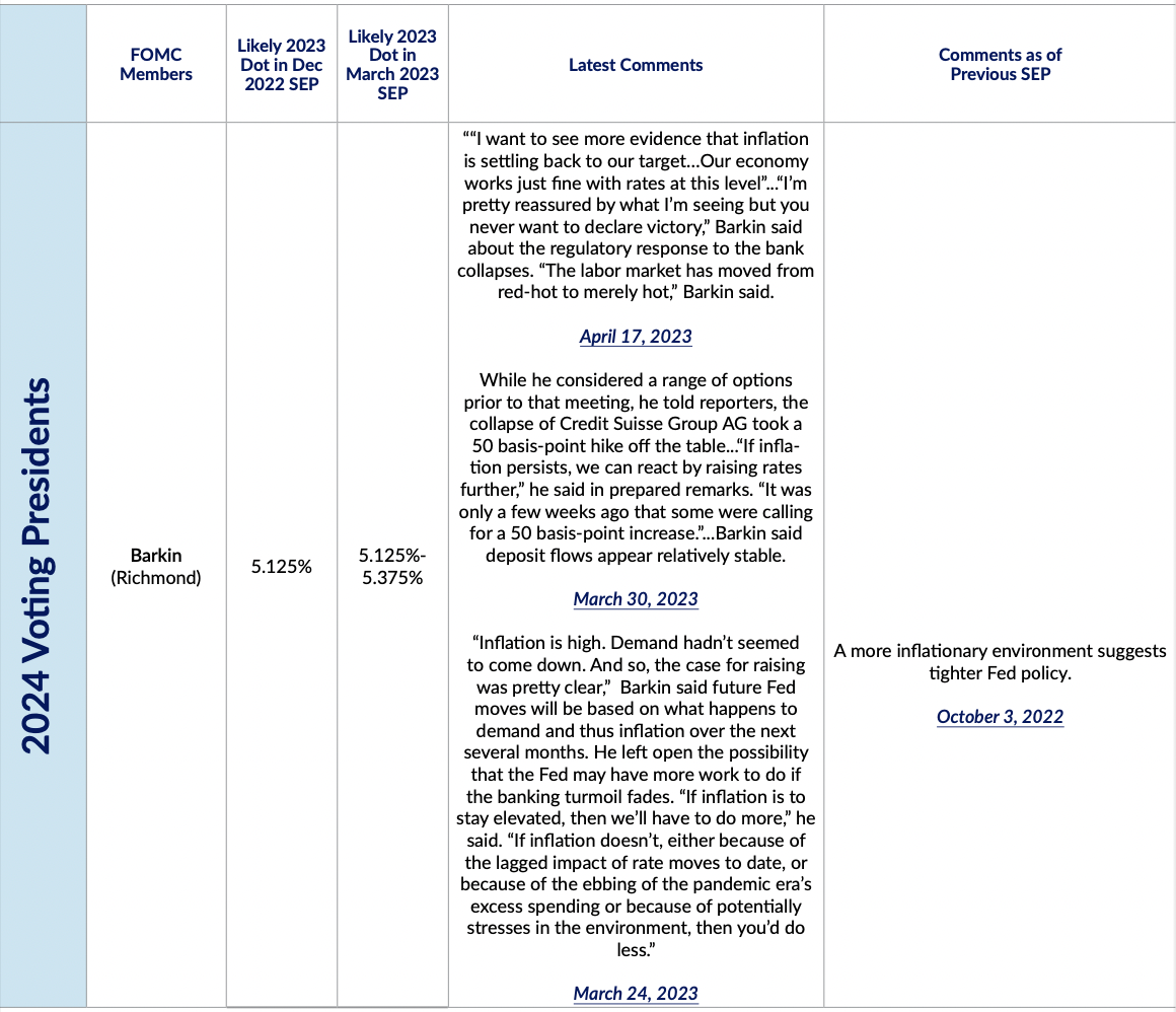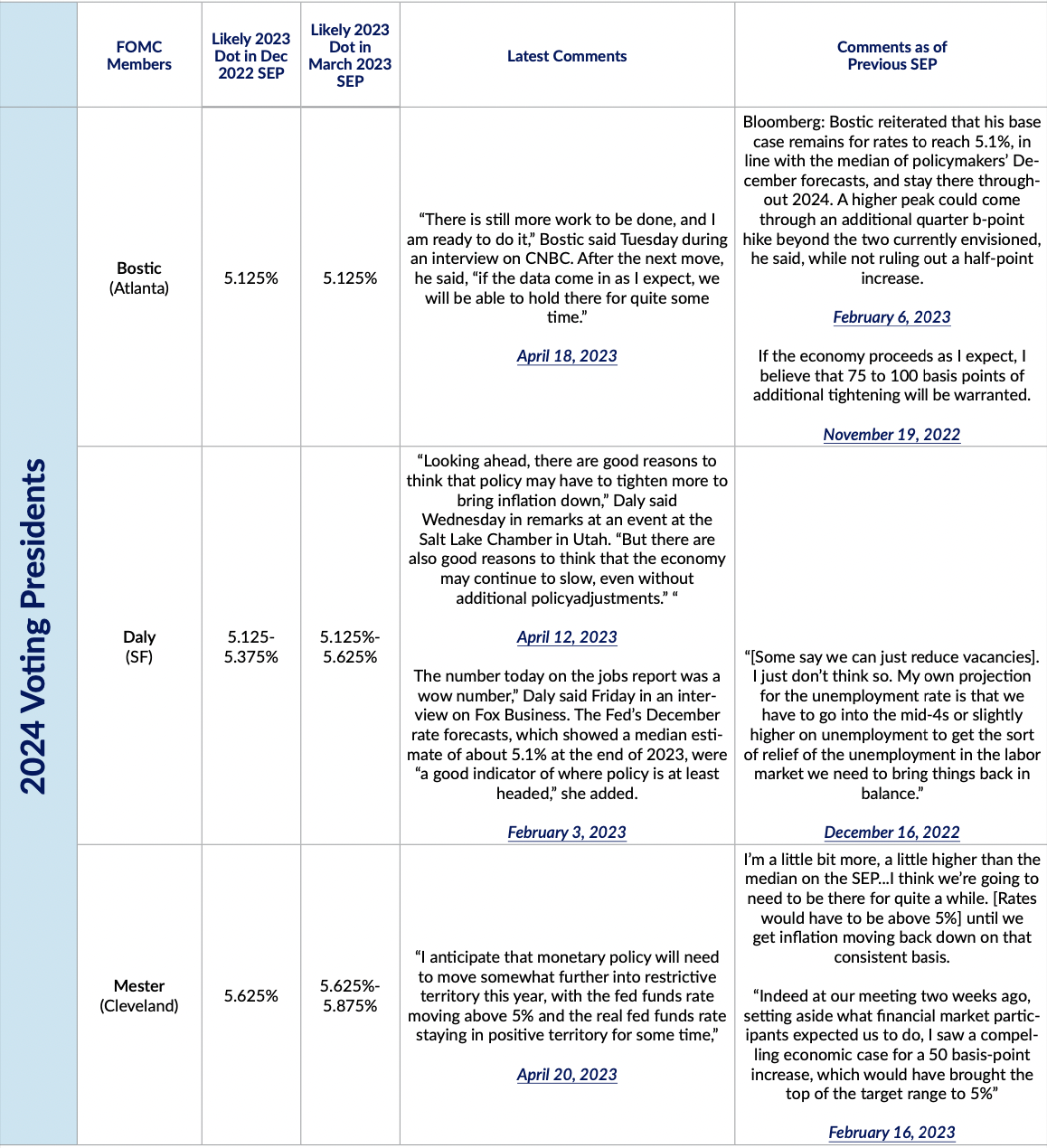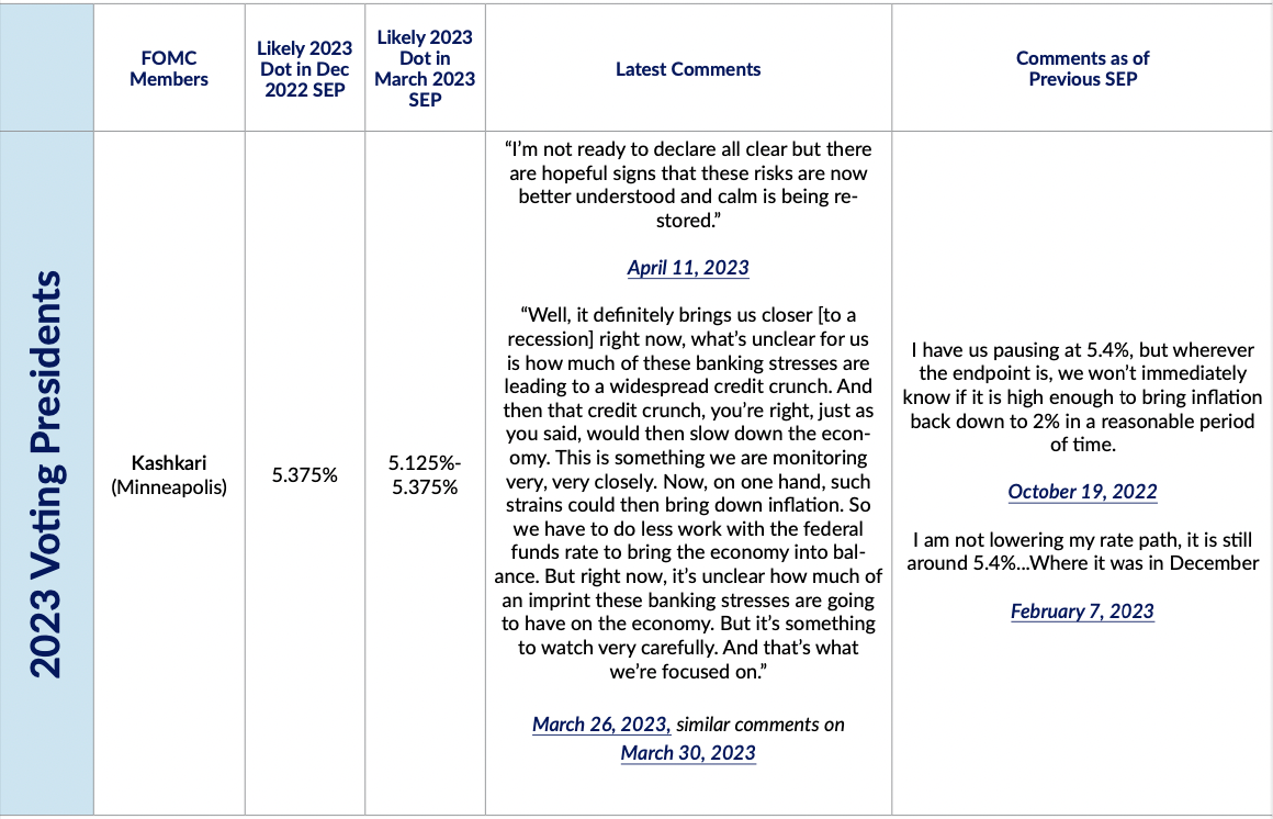 - Not out of the woods on bank credit tightening by any stretch: The Fed staff that support monetary policy decisions are not bank analysts. They, along with FOMC members, tend to only see these dynamics from a top-down perspective...recognizing risks only after they are publicly obvious. If you keep getting blindsided by banking challenges, the rational response is to proceed with greater caution. Former regional Fed presidents Eric Rosengren and Robert Kaplan have publicly reflected that sentiment more vocally in recent weeks. Fedspeak suggests that for many non-academic-macroeconomist FOMC members, the inclination to tread lightly and stop hiking after May is strong. For these members, they are most keen to avoid getting mugged by banking dislocations. Given the attenuated nature through which financial system transmits the Fed's policies to the real economy, they probably will keep being caught offsides. Claims that the Fed can manage financial stability independent of monetary policy decisions will keep coming sporadically under pressure.